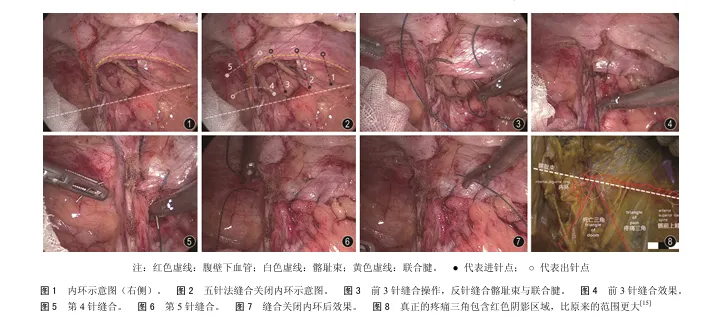 文章详细描述了TEP/TAPP手术下内环口缝合的操作方法,称为五针法。使用2-0倒刺缝线(Vloc型号)连续缝合,从外侧向内侧反针连续缝合。缝合面的下部,主要缝合的组织是髂耻束,缝合深度不可过深,以免伤及神经。缝合面的上部,主要缝合的组织为联合腱。靠近内侧缘时,由于此处的髂耻束已经难以缝上或者有损伤精索的风险,所以将此处的联合腱向内侧拉拢,并与腹壁下血管后方的腹横筋膜作1到2次的U型缝合,以关闭内环缺损,但注意需要保留精索通过的通道,避免卡压。缝合完毕后缝线免打结,剪断出针即可。文章附有示意图(图1至图7),分别展示了内环示意图、五针法缝合关闭内环的示意图、前三针缝合操作、前三针缝合效果、第四针缝合、第五针缝合以及缝合关闭内环后的效果。