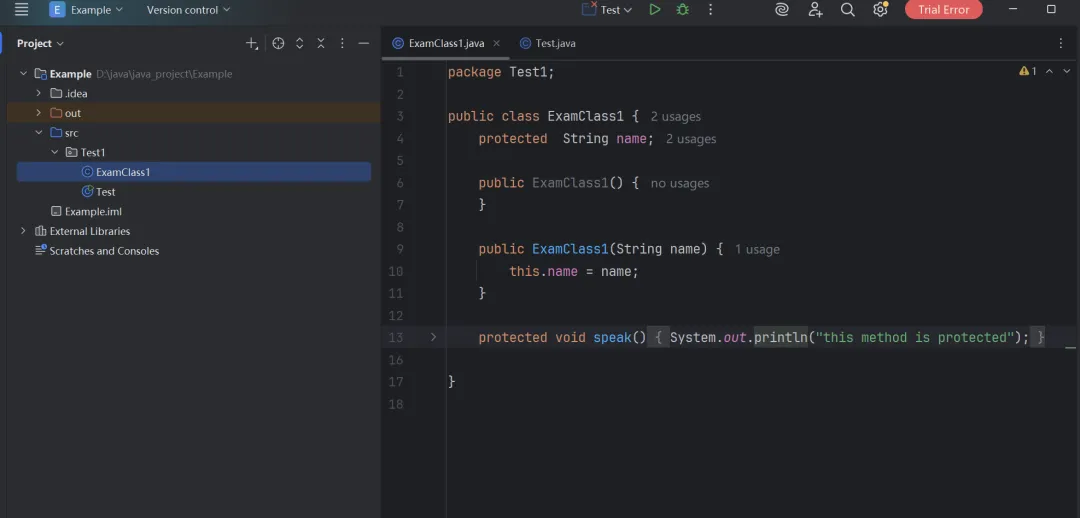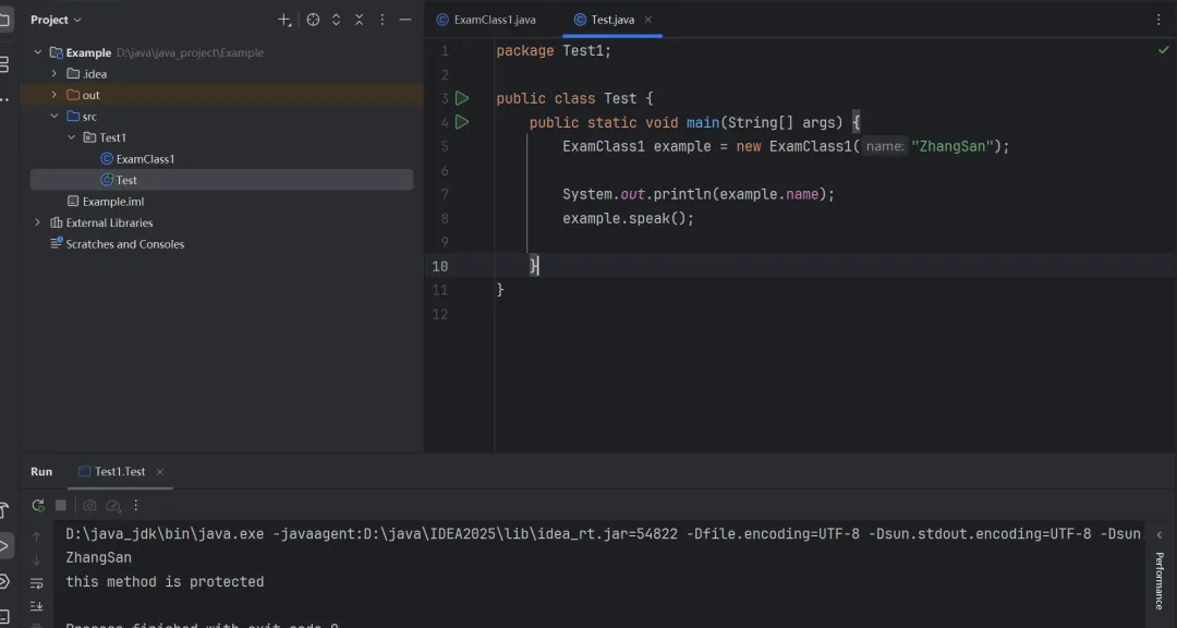 情况1:同属于一个包内,在Test中创建ExamClass1的实例对象。发现在Test中可以访问实例对象中被protected修饰的变量和方法。