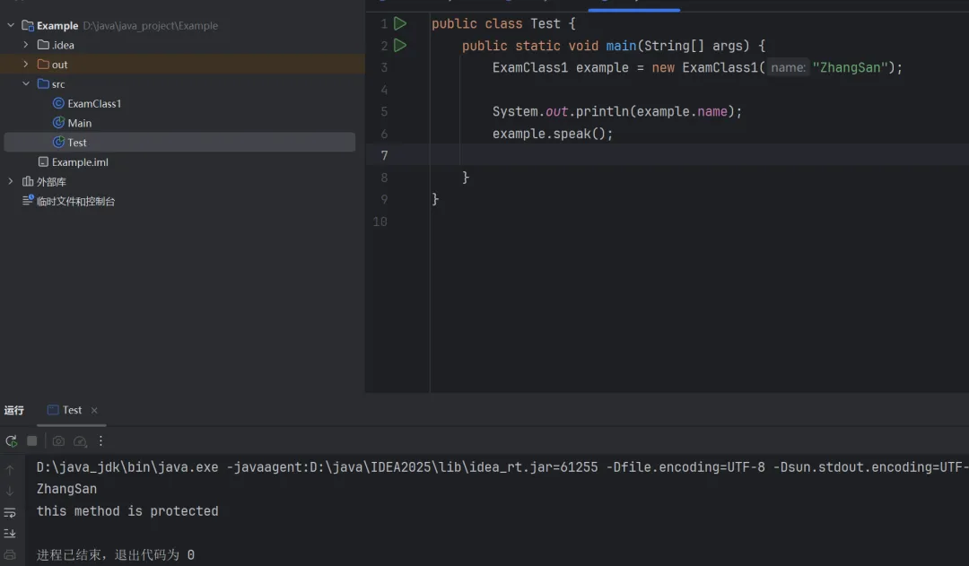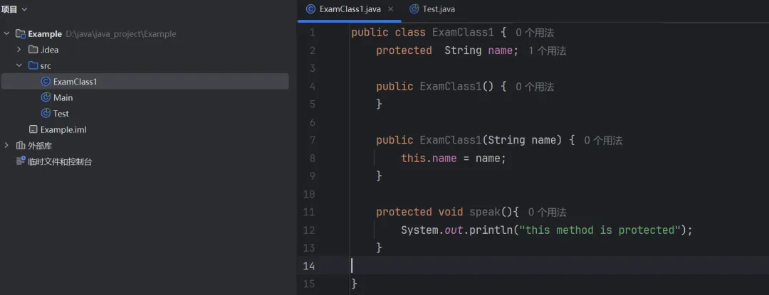 特殊情况:Test和ExamClass1没有声明包,所以他们实际上都在默认包里,此时Test中可以访问ExamClass1的实例化对象中被protected修饰的变量和方法