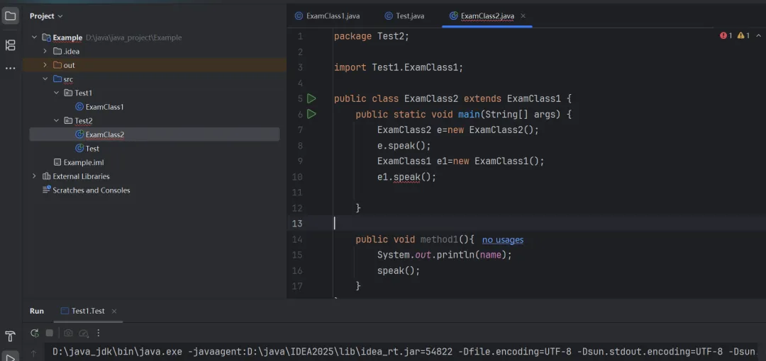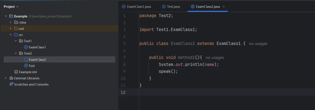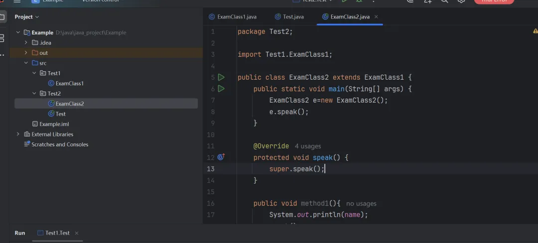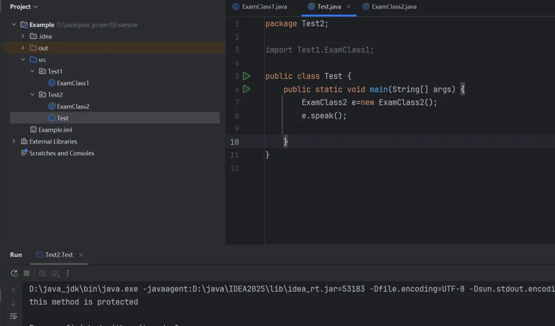 如图,我在ExanClass2中重写了其父类的speak方法,然后在Test中重新调用,发现可以调用了。因为这个时候,我调用的这个方法实际上是已经重写后的方法。而重写的这个方法,它来自ExamClass2,因此与ExamClass2在同一个包的其他class可以调用,ExamClass2的子类也可以调用