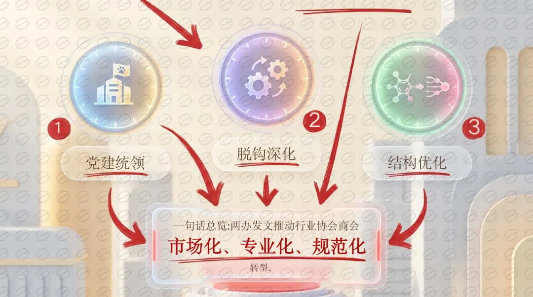 两办发文推动行业协会商会"市场化、专业化、规范化"转型,党建统领、脱钩深化、结构优化三管齐下。