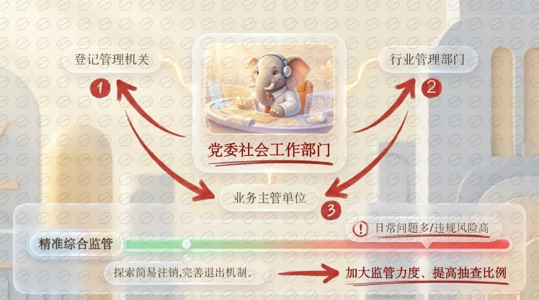 为什么重要: 脱钩之后的"真空"问题一直是痛点。这次文件明确建立了"党委社会工作部门统筹+多部门协同"的综合监管体制,并且首次提出"分类管理制度"——高风险的高频查,低风险的少干预。这是一个从"一刀切"到"精准监管"的信号。