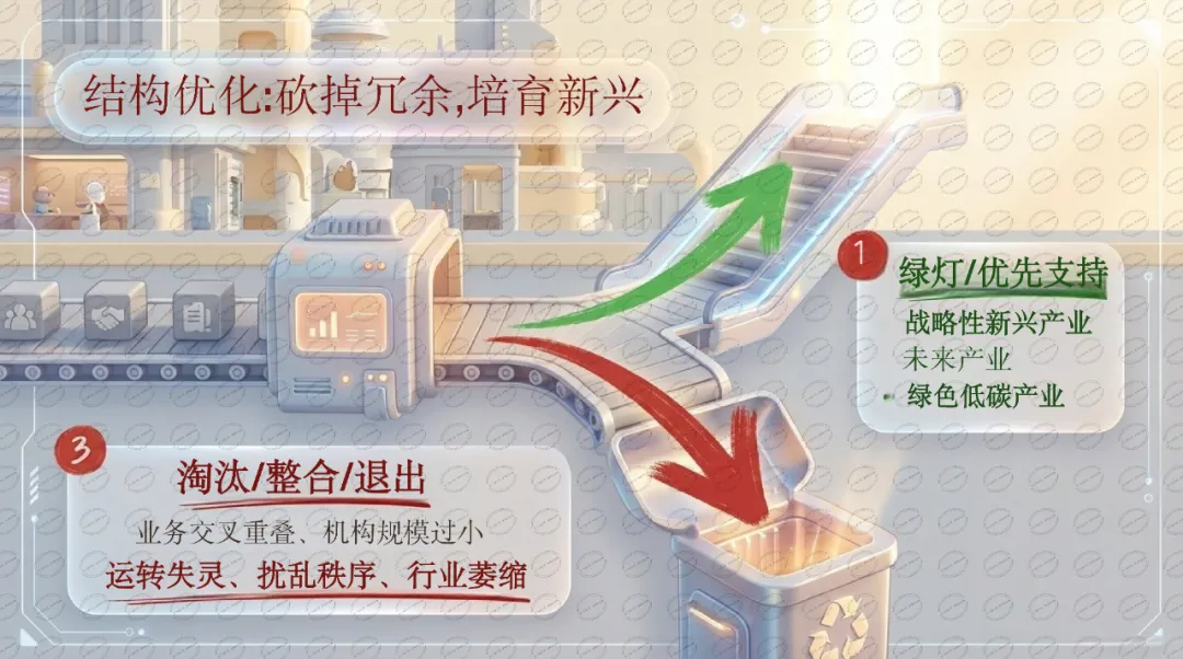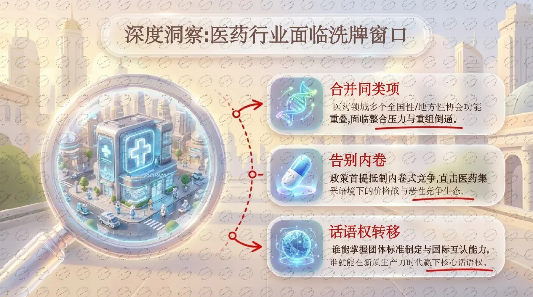 为什么重要: 这是一轮"供给侧结构性改革"。传统行业协会数量过多、功能重叠是长期积弊。文件明确要整合"小弱散"、淘汰"空转乱",同时为新质生产力相关领域(战略性新兴产业、未来产业、绿色低碳)开绿灯。医药行业属于传统优势产业,现有协会可能面临整合压力。