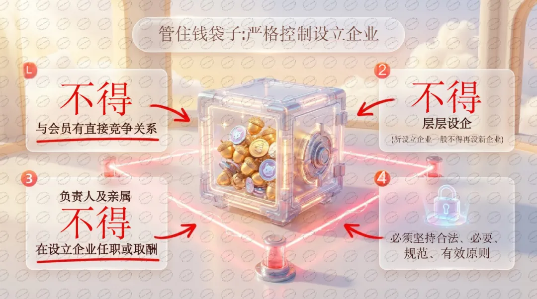 为什么重要: 这一条针对性极强。过去部分协会通过设立关联企业牟利,是腐败高发区。文件用"四个不得"(不得与会员竞争、不得超范围、不得层层设企、负责人及亲属不得在关联企业取酬)堵住这条灰色通道。