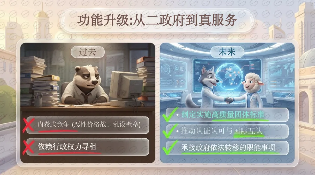为什么重要: 文件首次明确写入"抵制内卷式竞争",这与中央经济工作会议精神一脉相承。同时,政府职能向协会商会的有序转移,意味着有能力的协会将获得更多"职能承接"的机会,实质上扩大了业务空间。