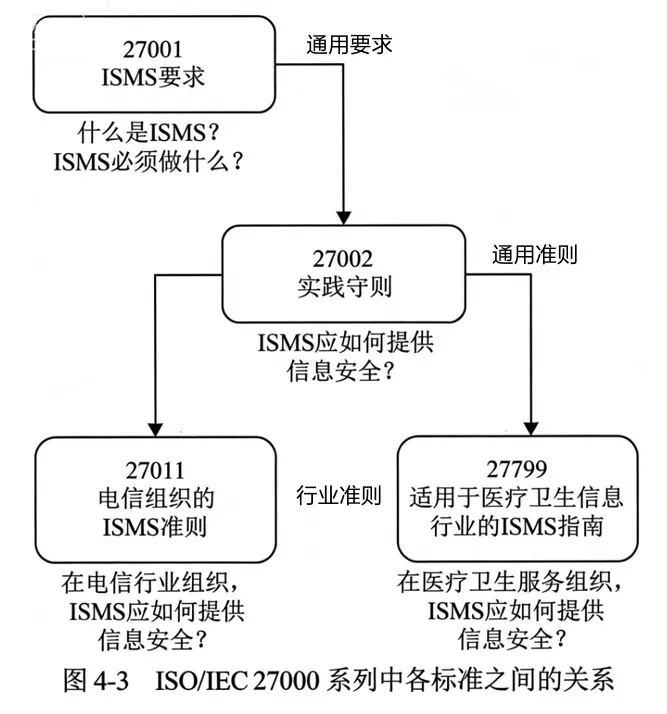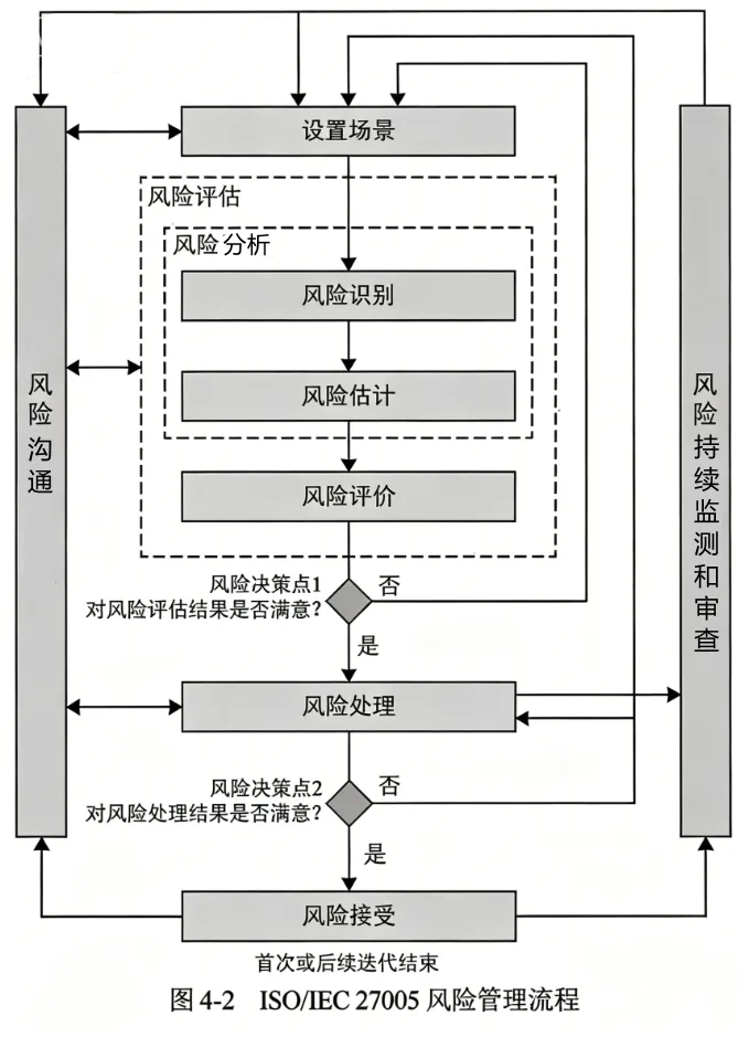 NIST RMF描述了风险管理流程的七个步骤,由于组织的信息系统不断演变,风险管理的循环过程也将永无止境。安全专家需要分析系统的每个更改以确定是否应触发新的风险管理循环。NIST 风险管理框架的第一步是确保战略和运营层面的顶级管理层和高级领导们在整个组织中保持同步,包括就角色、优先级、约束条件和风险容忍度(RiskTolerance)等方面达成一致。NIST 风险管理框架的第二步是基于由组织内的信息系统所处理、存储或传输信息的关键和敏感程度,对组织的信息系统分类。描述此客户关系管理系统CRM安全类别(SecurityCategory,SC)的格式如下:SC(crm)={(机密性,高), (完整性,低), (可用性,低)}基于最高安全目标类别确定系统的全局类别,所以称这种分类方法为“高水位标记法(HighWater Mark)”。NIST RMF定义了三种安全控制措施类型:通用控制措施、系统特定控制措施和混合控制措施。系统特定控制措施(System-Specific Controls)在特定系统边界内实施,而且显然只保护该特定系统。实施安全控制措施这一步骤有两个关键任务:实施(Implementation)和文档记录(Documentation)。首先,文档让组织了解当前安全控制措施的内容、位置和原因。文档记录工作之所以重要的第二个原因在于文档记录可将安全控制措施完全集成到全局评估和持续监测计划中。组织实施的安全控制措施只在可评估时才对全局风险管理工作有用。注意:对安全控制措施的评估也称为审计。在风险管理框架的授权阶段,信息系统的风险和控制评估结果将呈送给适当的决策方,以获得将该系统连接到组织全局架构中运行的批准。4.2.2 ISO/IEC 27005 信息安全风险管理指南
