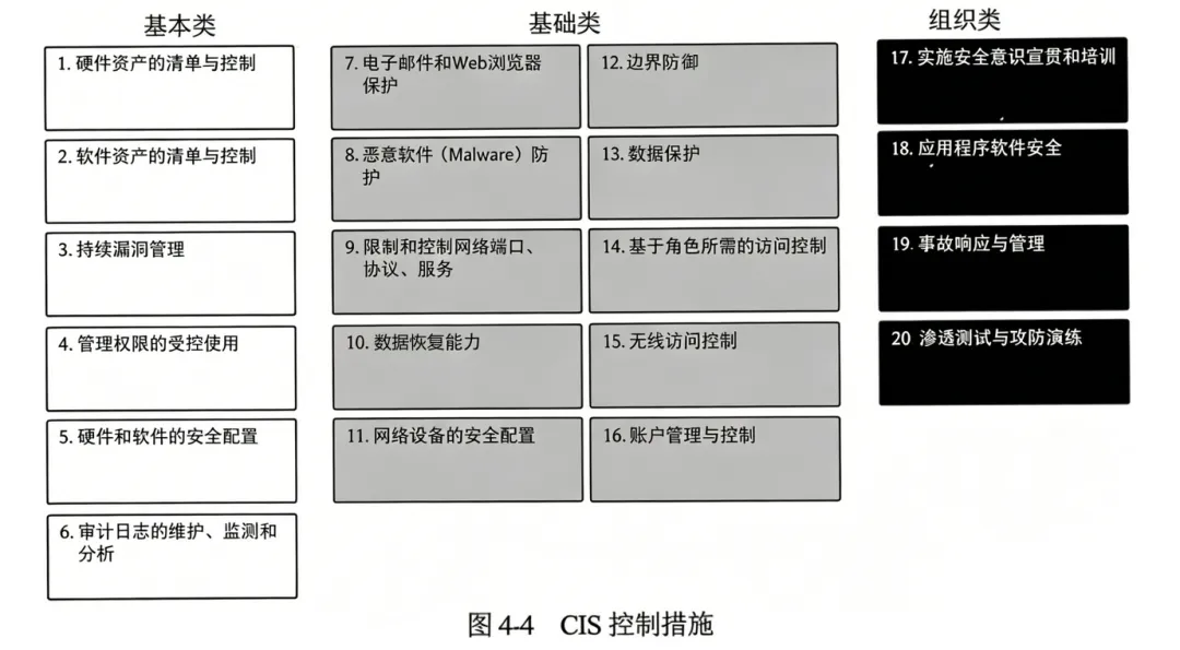 如何实施控制目标,以达成安全计划和企业安全架构所列出的目标。这就是安全控制措施框架(Security Control Framework)的用武之地了。本节介绍三个常见框架:NIST SP800-53、CIS控制措施(CIS Controls)和COBIT(信息系统和技术控制目标)。NIST SP 800-53,即《信息系统和组织的安全和隐私控制措施(Security and Privacy Controlsfor Information Systems and Organizations)》,描述了美国联邦机构为符合美国联邦信息处理标准(Federal Information Processing Standards,FIPS)需要实施的控制措施。其规定了实施安全控制措施的四个步骤:(1) 选择适当的安全控制措施基线(Baseline)。CIS知道并非每个组织都拥有实施所有控制措施所需的资源,也不是每个组织都面临所有的风险。因此,将CIS控制措施分为以下三个类别。- 基本类(Basic):每个组织都应实施基本类的关键控制措施,实现最低限度的必要安全。