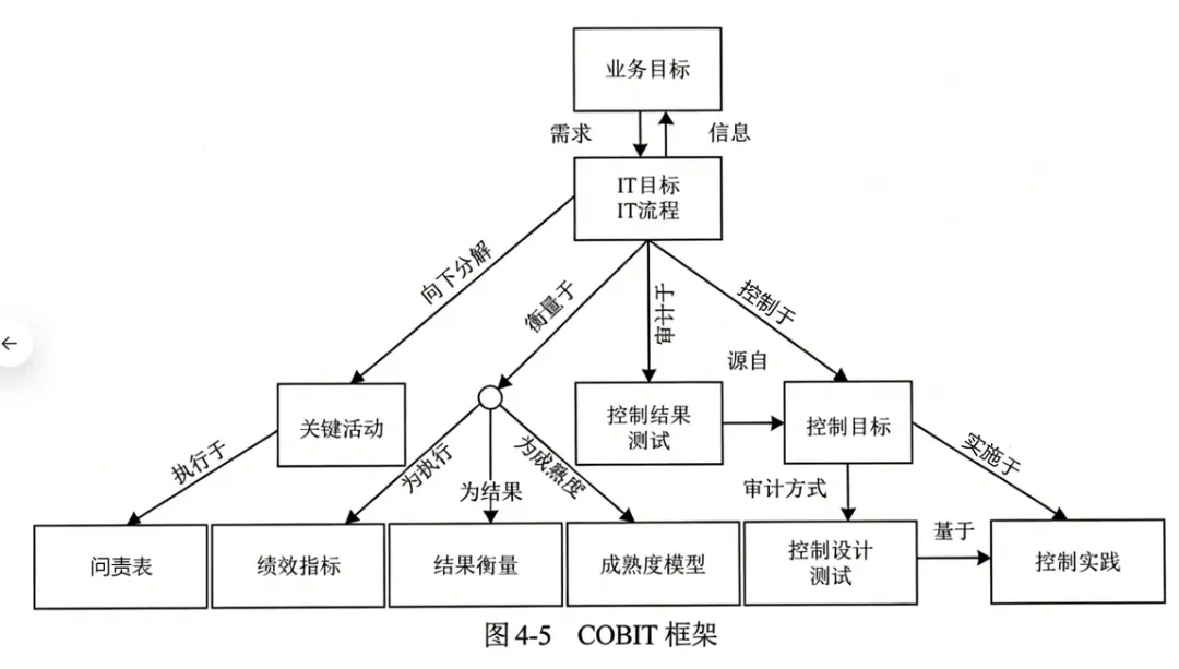 实施组(Implementation Group,IG)是帮助组织将各控制措施的实施程度与资源水平匹配的工具。CIS控制措施框架7.1版描述了以下三个IG。IG1的组织试图保护的数据的敏感程度很低,主要围绕员工和财务信息。IG2的组织经常存储和处理敏感的客户或公司信息,并可能有监管和合规方面的担忧。发生违规行为所导致的公众信心丧失是这类组织的主要的关注点之一。IG3组织的系统和数据包含受监管的敏感信息或功能。对此类组织的成功攻击可能对公共福祉造成重大损害。COBIT 2019,即信息系统和技术控制目标(Control Objectives for Information and relatedTechnology,COBIT)2019版,该框架通过平衡资源利用率、风险水平和收益实现以帮助组织优化IT价值,是一种基于治理体系六项关键原则的全局方法:COBIT 框架中的每项内容都通过一系列“自上而下”的目标转换,最终与各利益相关方关联。概念很简单:在IT治理或管理过程的所有节点上,组织都应自问“为什么要这样做?”而答案则应是某项与企业目标相关联的IT目标,这个企业目标也相应联系着利益相关方的某项具体需求。COBIT 框架包括企业治理和管理。两者的差异在于:治理是一套更高层面的流程,旨在平衡利益相关方的价值主张;而管理则是实现企业目标的一系列活动。简而言之,可认为治理是XO级别的领导层所做的事,而管理则是组织内其他领导层所做的事。在行业中,目前使用的大部分安全合规性审计实践都基于COBIT。4.4 企业架构框架