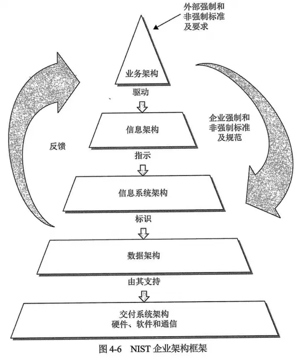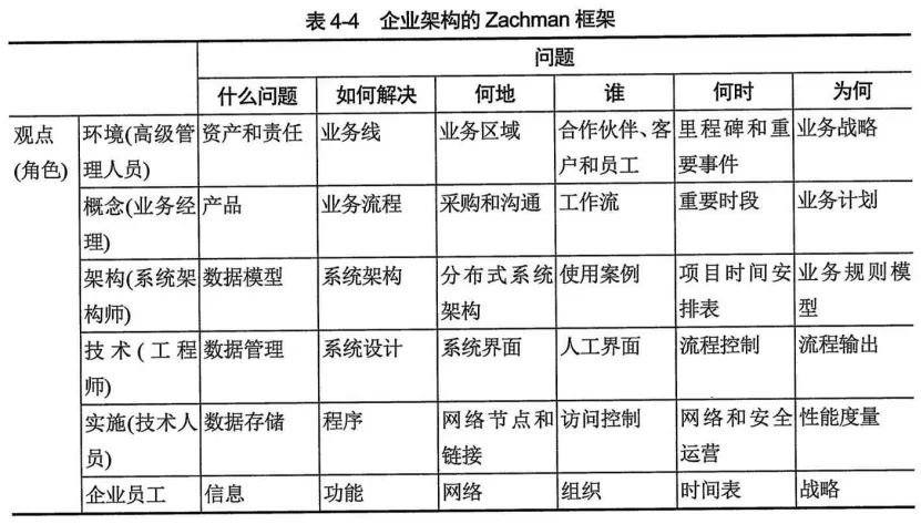 Zachman框架(Zachman Framework)是最早出现的企业架构框架,该框架是由六个基本的疑问词(什么问题、如何解决、何地、谁、何时及为何;What、How、Where、Who、When及Why)与不同角色(高级管理人员、业务经理、系统架构师、工程师、技术人员和企业员工)的角度相交所组成的二维模型,提供对企业的全局理解。4.4.3 TOGAF