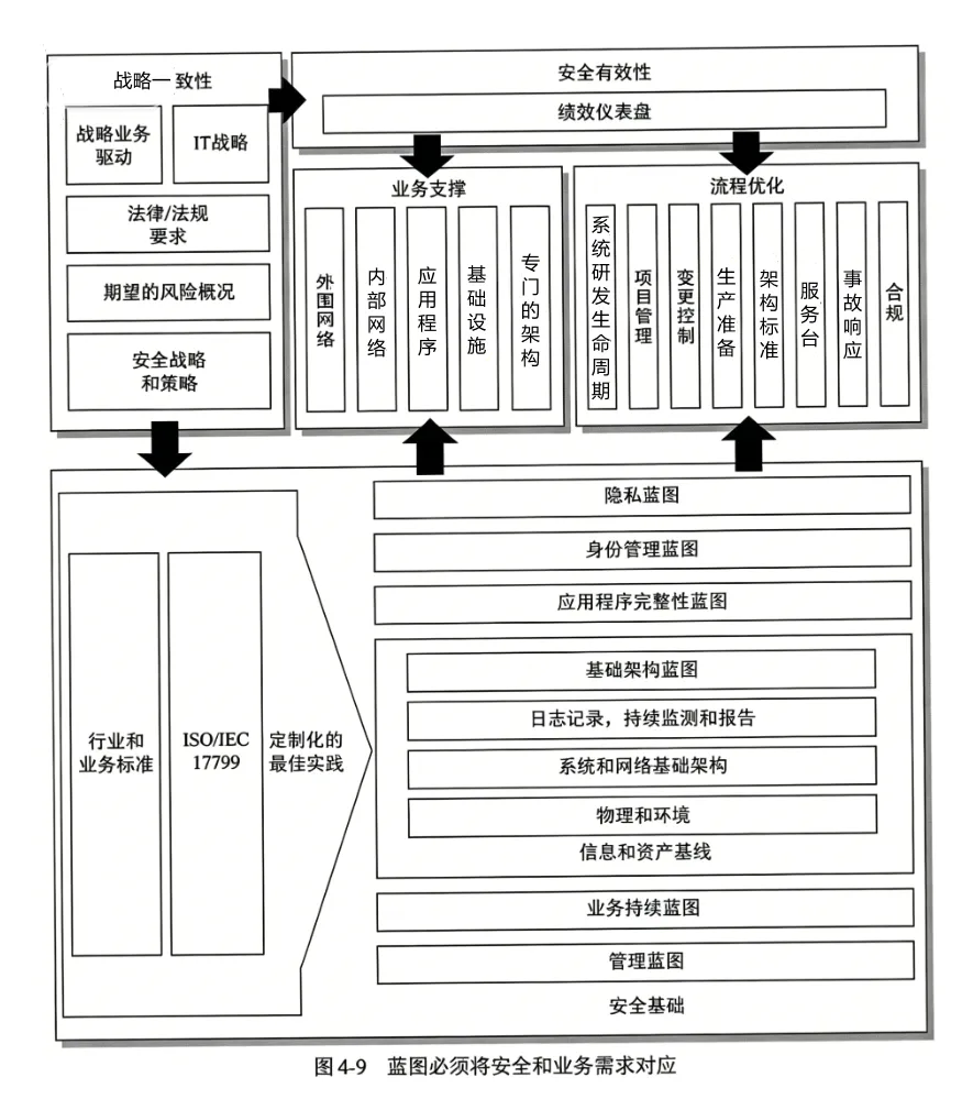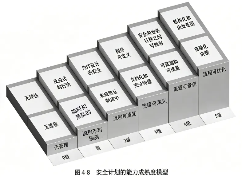“更好”是一个模糊和不可计量的概念。可真正得到提高的唯一方法是:知道从什么程度开始,需要达到什么程度,以及需要在这两者之间采取的步骤。CMM模型里的每个成熟度等级代表一个改进阶段。有些安全计划是混乱的、临时的、不可预测的,而且通常是不安全的。有些安全计划创建了文档,但在实际流程中并没有生效。而另一些安全计划却非常先进、精简和高效。安全计划应采用自上而下的方法(Top-downApproach),这意味着启动、支持和指导都来自于最高管理层(TopManagement);中级管理层(MiddleManagement)传达最高层意图,最后下达到一线工作人员。CMM的关键是制定出可遵循的结构化步骤,依据这些步骤,组织就可从一个层次提升到下一层次,并不断改进流程和安全态势(Security Posture)。4.6 各类框架的集成