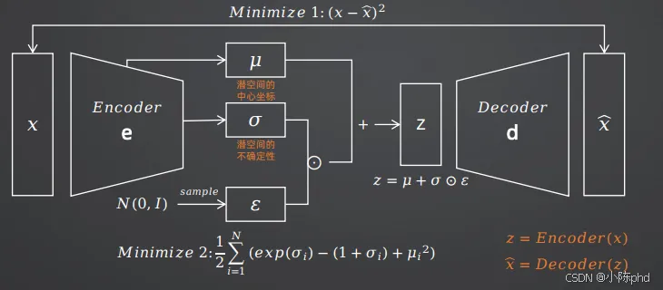 对于每张输入图像x,编码器不再输出一个固定的潜向量z,而是输出一个高斯分布的均值(μ)和方差(σ²)。然后我们从这个分布中采样一个潜向量z,再送入解码器生成图像。