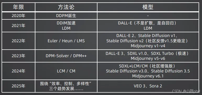 从2020年DDPM诞生到今天,扩散模型的技术演进主要围绕**"效率"和"控制"**两大主题展开,形成了两条清晰的技术路线: