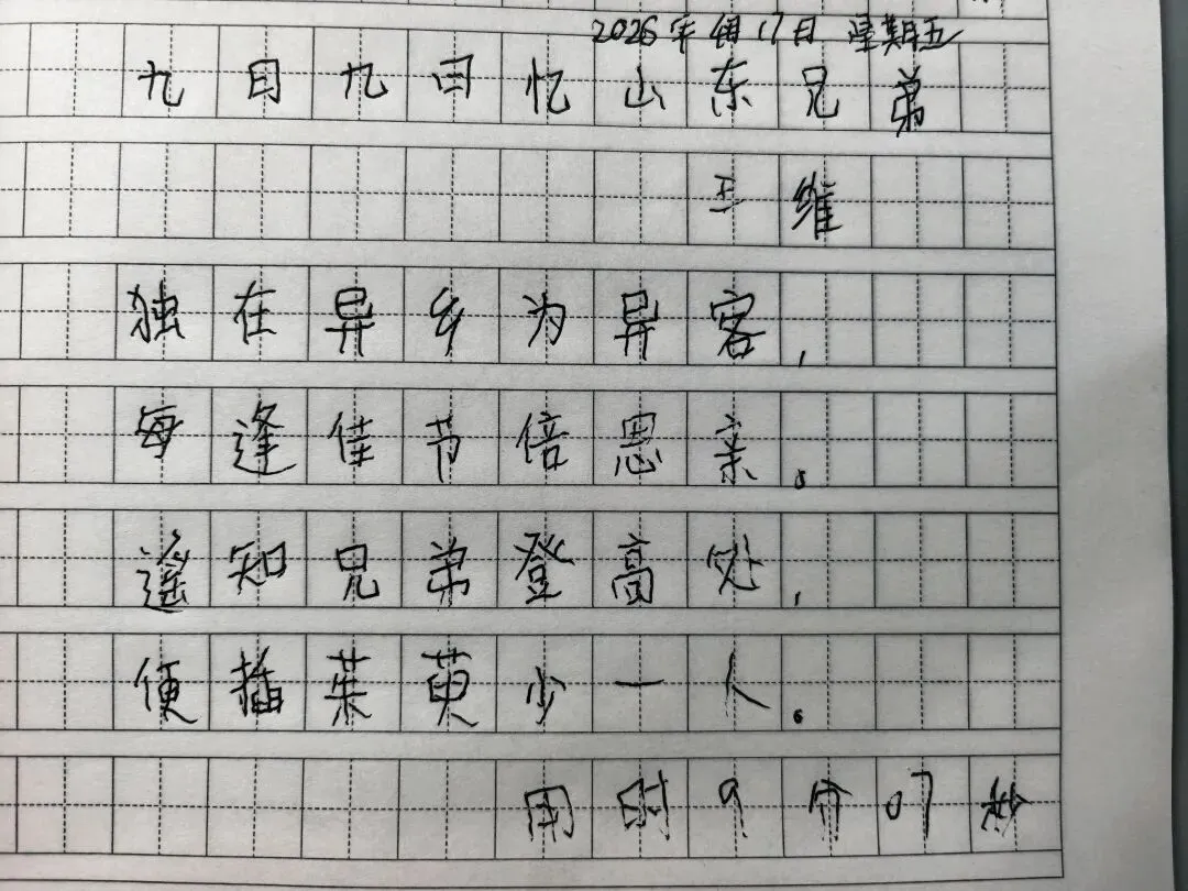今天早饭前完成了王维《九月九日忆山东兄弟》的抄写,整体用时9分07秒。一笔一划写下来,对诗句的结构、用字和内容都有了更清晰的认识。