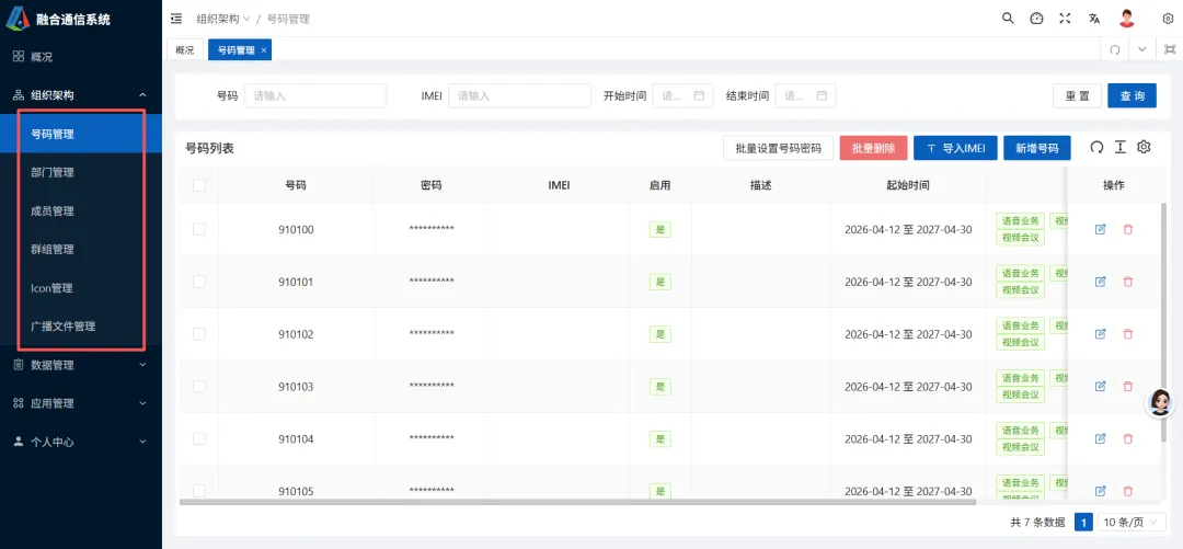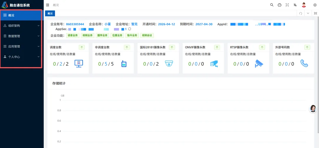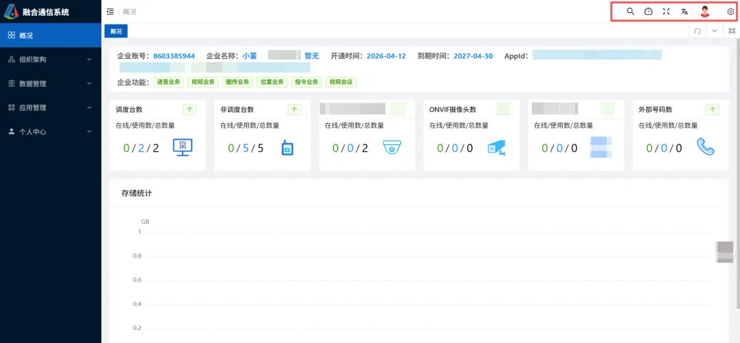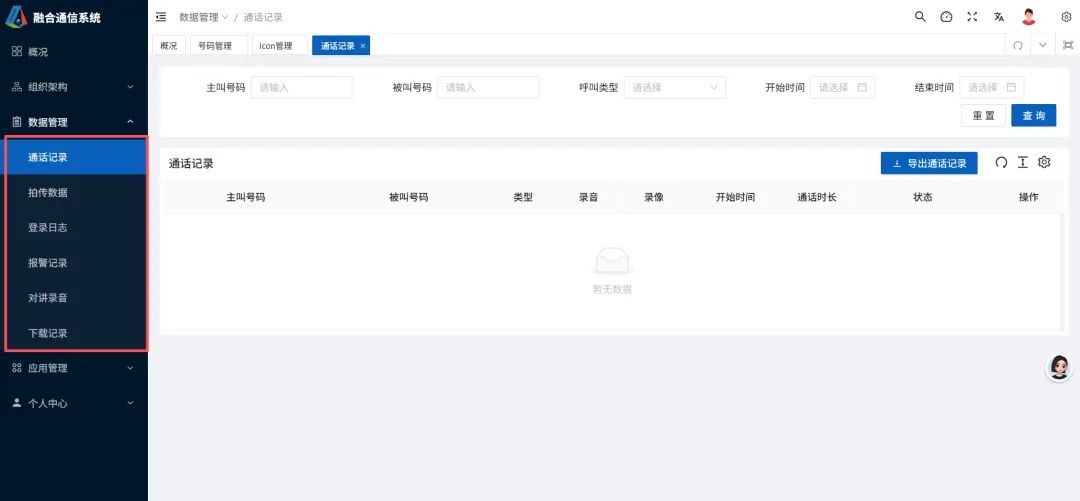 从主界面我可以看出这是融合通信平台的控制台,支持语音、视频7图传、位置、等多种业务功能。右上角有搜索、调度台、全屏页面、锁定屏幕、主题设置等模块。左侧导航栏:包含「概况」「组织架构」「数据管理」「应用管理」「个人中心」,应该 是平台的核心功能菜单。组织架构里包含部门管理、成员管理、群组管理 、Icon管理、广播文件管理。数据管理模块包括: 数据管理、通话记录、拍传数据、登录日志、报警记录、对讲录音、下载记录子模块。