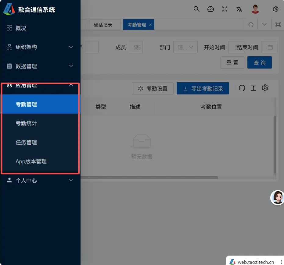应用管理模块包括考勤管理、考勤统计、任务管理、APP版本管理模块。