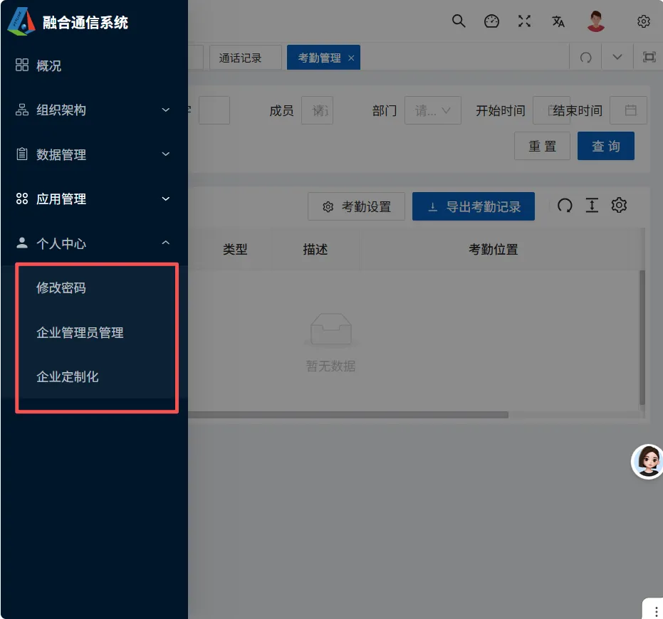 个人中心模块包括:修改密码、企业管理员管理、企业定制化。