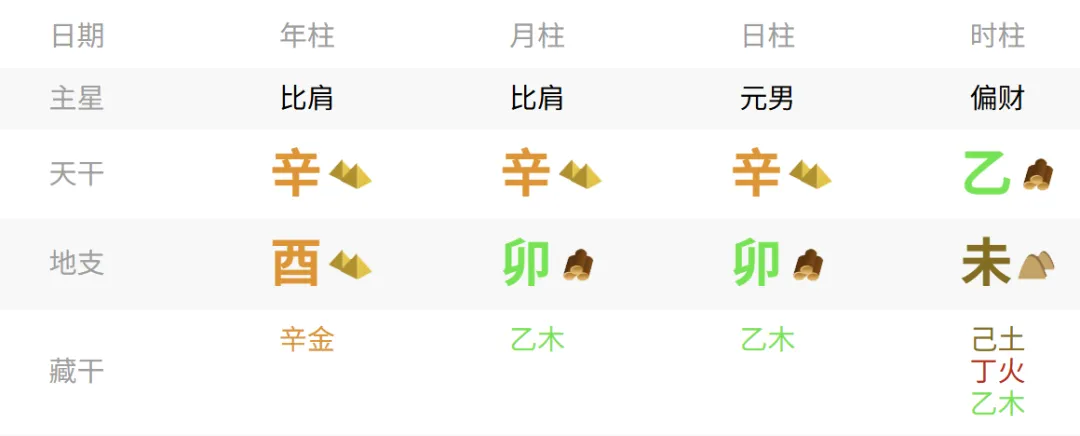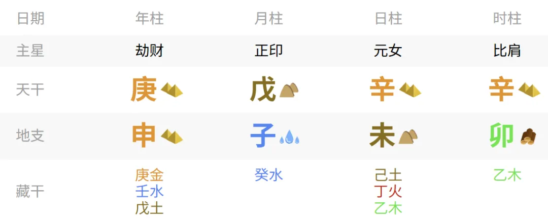 家里有财,能自己干,但是辛金治不住卯木,需要借外面的力,这个命有财,但是也需要比劫旺才行,这个命比劫旺挣钱,比劫弱亏钱。年上有庚申劫财,但是被子水化了,命主借了姐姐的光,她在姐姐的养殖场工作,有股份。