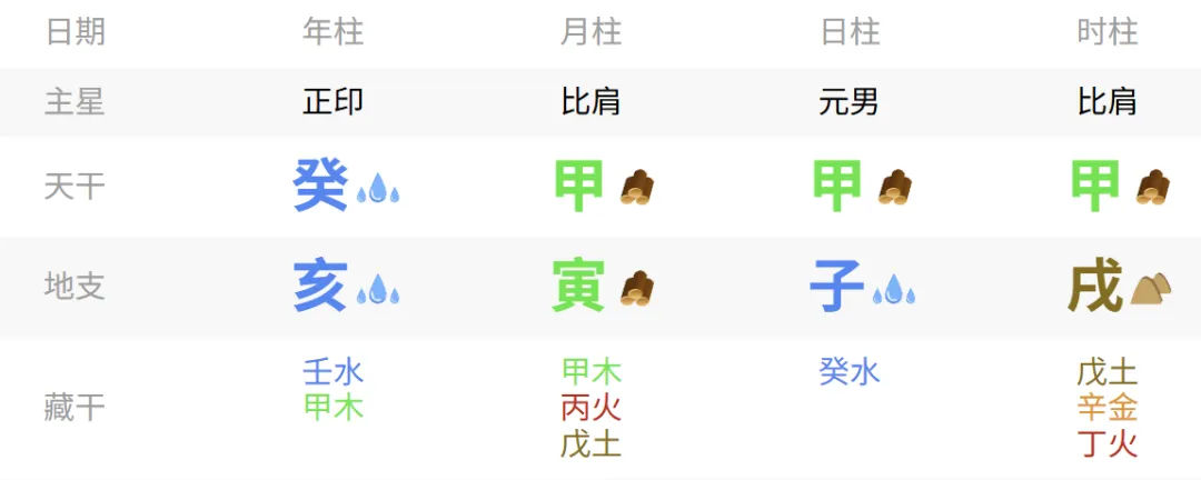 比劫制财,财在家里,有几个比劫制财就有几个股东。数人数:甲寅是一个人,甲子是一个人,甲戌也是一个人,这里就三个人了,再看癸水生了甲木,代表癸水投资了但是没露面,亥里面的甲木也是一个人,这里又两个人。然后时上的甲木在月令有根,这里可以多算一个人,一起6个人。实际是命主爸爸和伯伯一起买地皮盖了楼,租出去很多房子,爸爸和大伯各有一半房产,是两个大股东,命主爸爸给了命主一部分,命主是个小股东,这里月上的甲寅最大,就是他伯伯。印生比劫再生我,也是挂靠的一种方式,比劫带的印,说明伯伯认识官家,走关系买的地皮。