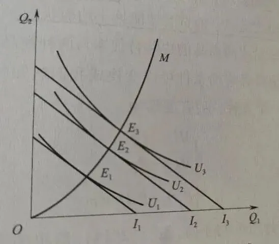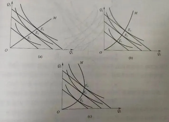 推导过程:两种商品价格不变,只有消费者收入发生改变。消费者收入变动,使预算约束线向右上或左下平移。每条预算约束线均有相应条件下的无差异曲线与其相切,消费者均会选择效用最大化的商品组合,即切点,或者说均衡点,连接这些均衡点可以描绘出一条曲线,即消费者收入扩展线。