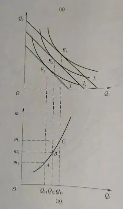 ②图(b):曲线向右上方倾斜,斜率逐渐增大。表明两种商品都是正常品。随着收入增加,第一种商品的数量增长缓慢,是必需品,第二种商品的数量增长快,是奢侈品。