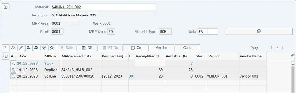 - 如果存在具有关联供应商的补货元素,可以显示包含供应商编号和供应商名称的附加列。在下图中,显示了计划行的供应商信息。