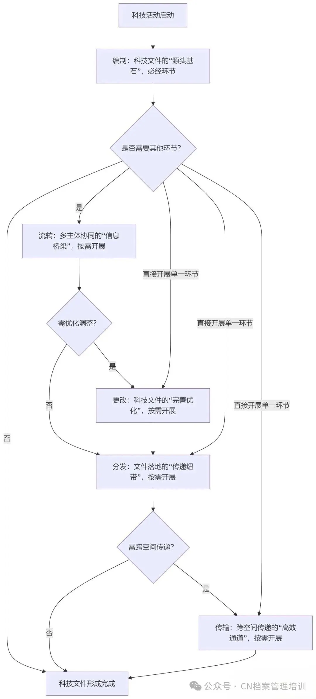 这里需要重点澄清一个核心误区:除了编制之外,流转、更改、分发、传输等活动均不具备普适性,并非所有科技文件的形成都需要逐一经历这些环节。具体而言,每个步骤的开展都与科技活动的类型、复杂度、参与主体密切相关,各环节各司其职、各有侧重,共同勾勒出科技文件从雏形到完善的完整轨迹。