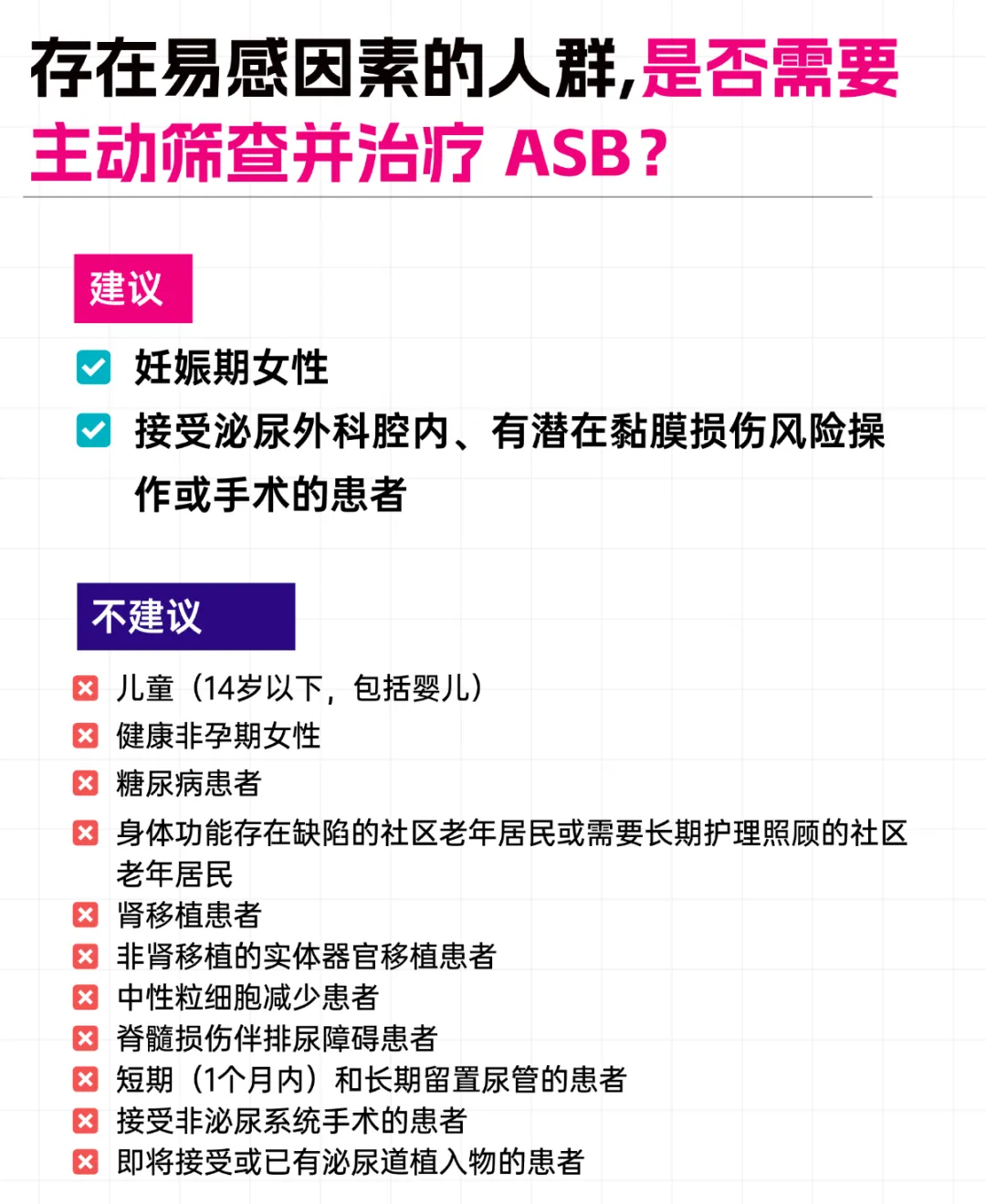 对于接受泌尿外科腔内、有潜在黏膜损伤风险操作或手术的患者(例如经皮肾镜碎石取石术、经尿道输尿管镜相关操作),建议进行筛查和治疗 ASB,以达到减少尿源性脓毒血症等感染相关的严重并发症的目的。