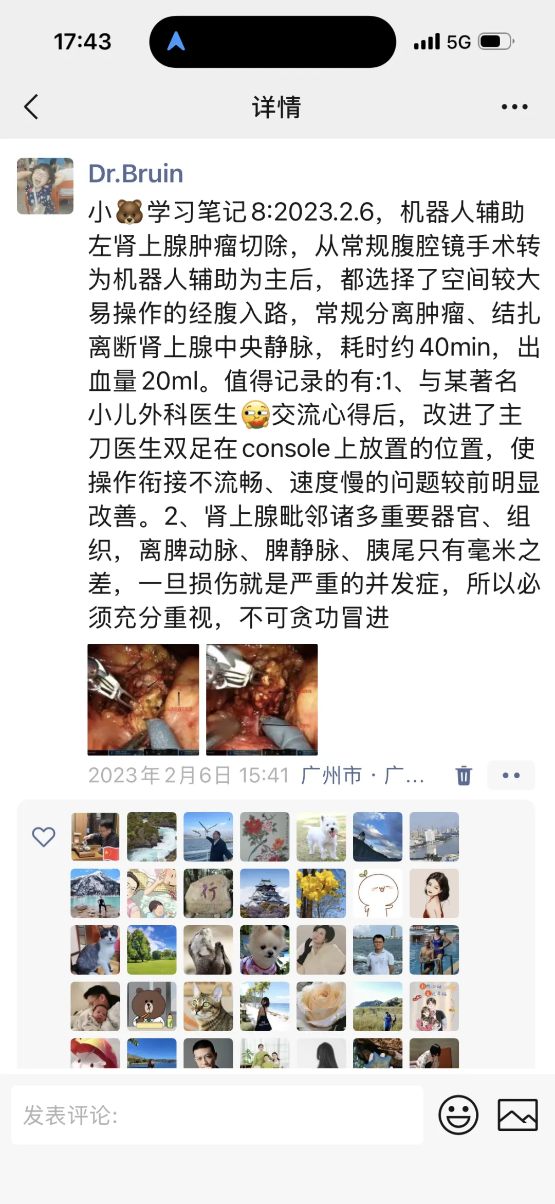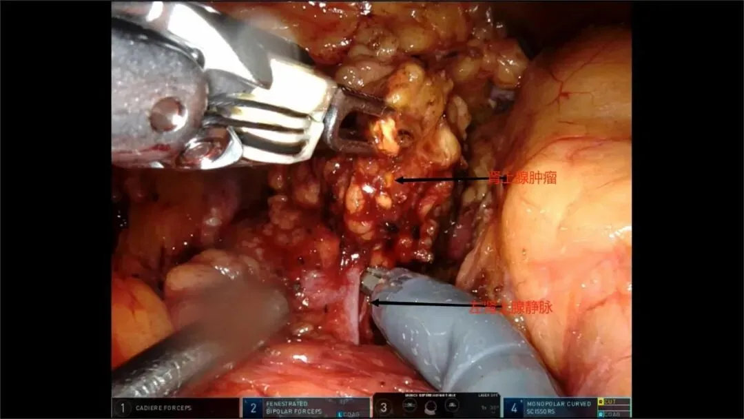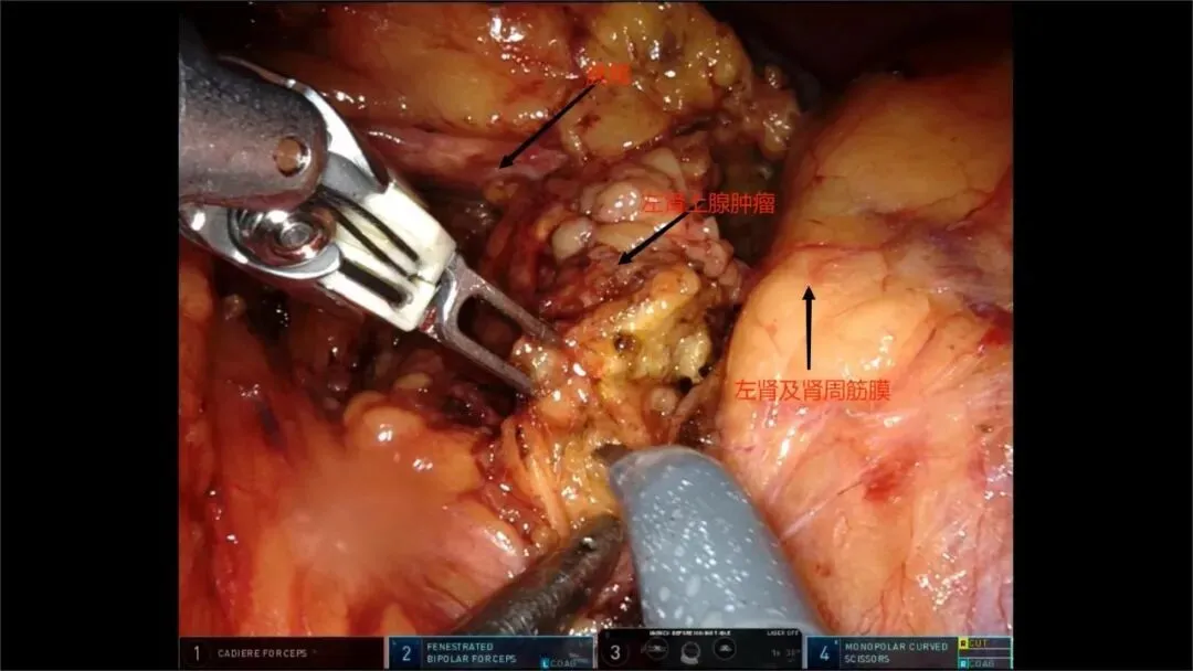 机器人辅助左肾上腺肿瘤切除,从常规腹腔镜手术转为机器人辅助为主后,都选择了空间较大易操作的经腹入路,常规分离肿瘤、结扎离断肾上腺中央静脉,耗时约40min,出血量20ml。值得记录的有:1、与某著名小儿外科医生交流心得后,改进了主刀医生双足在console上放置的位置,使操作衔接不流畅、速度慢的问题较前明显改善。2、肾上腺毗邻诸多重要器官、组织,离脾动脉、脾静脉、胰尾只有毫米之差,一旦损伤就是严重的并发症,所以必须充分重视,不可贪功冒进。