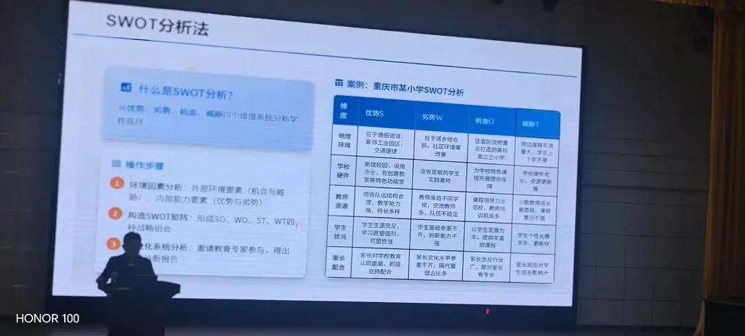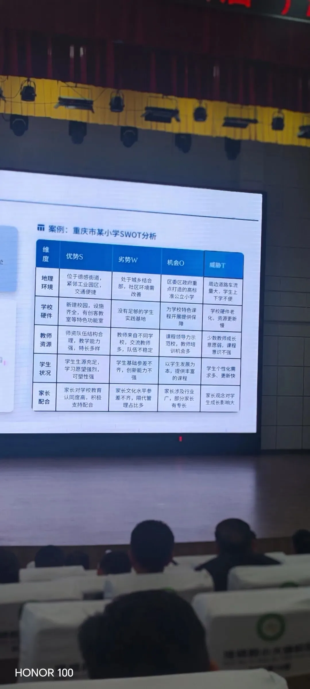 4.调研评估:通过问卷、访谈、课堂观察、数据测算等方式,全面调研学校办学现状;运用SWOT分析法,梳理学校优势、劣势、发展机遇与外部威胁,形成客观的诊断评估报告,找准发展痛点。