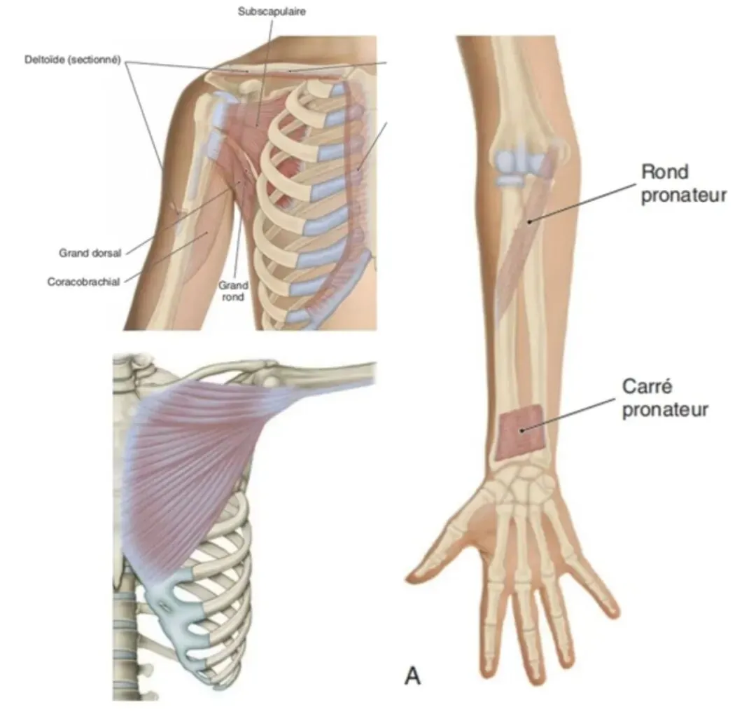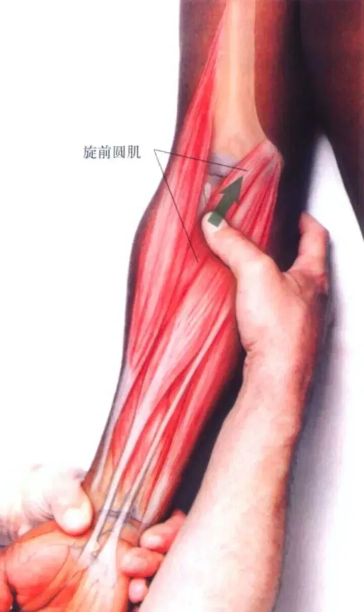 2. 前臂部(郄门穴区域): 旋前圆肌是前臂旋前的关键肌肉,起于肱骨内上髁,止于桡骨中段外侧。其收缩可直接驱动前臂旋前。旋前方肌位于尺桡骨远端之间,收缩时也可使前臂旋前,并稳定远端尺桡关节。
