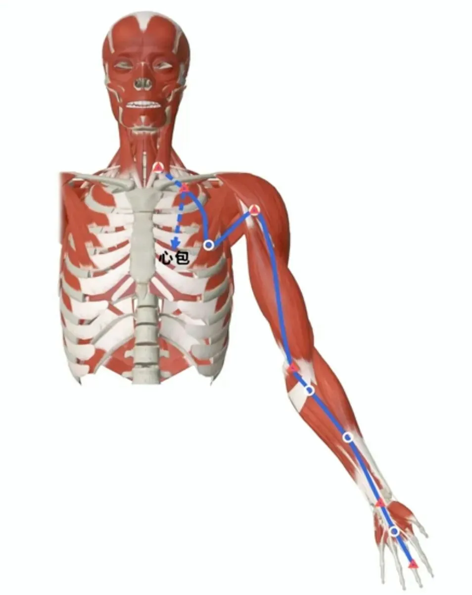这条经脉内属于心包,心包是心脏的保护层,代心受邪。因此,心包经的功能主要是辅助心脏的血液循环,尤其与心肌供血、冠状动脉功能相关。当心包经异常时,可出现心肌缺血、心烦、胸痛,以及沿经部位的疼痛、结节等。