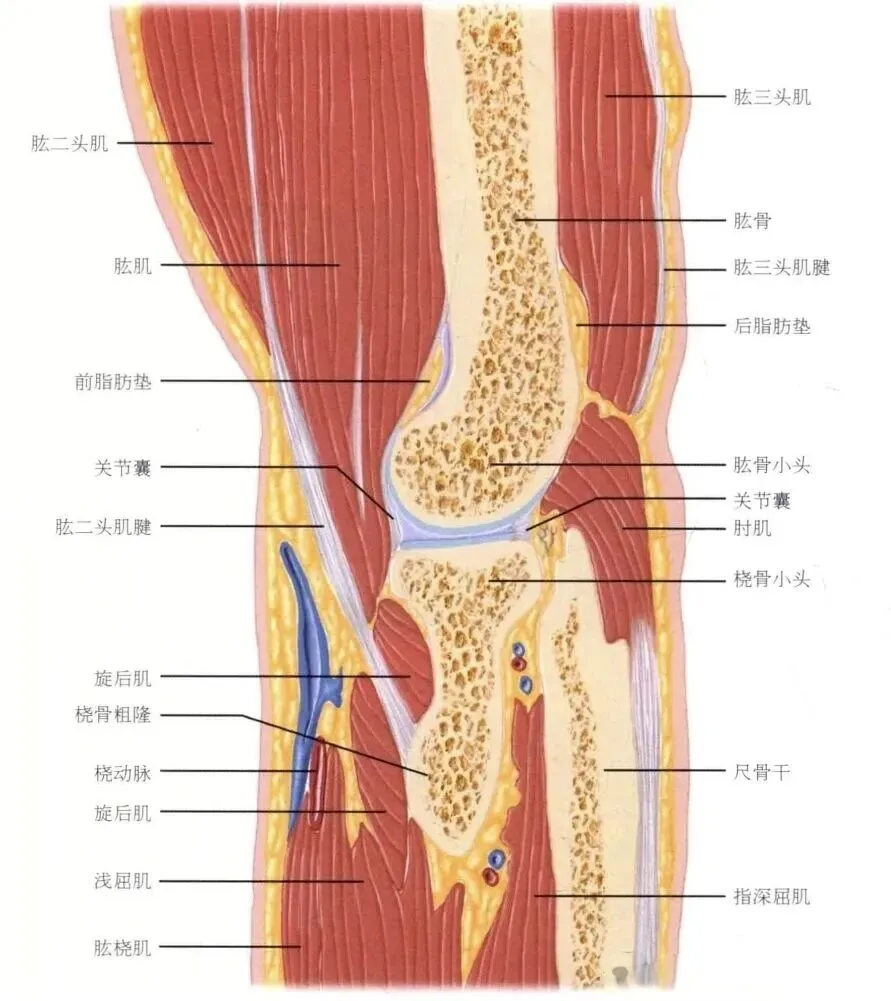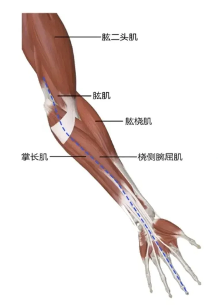 3. 肘关节部(曲泽穴、尺泽穴附近): 旋前圆肌起点处,肱二头肌腱膜在此与深筋膜交织,形成筋膜交错区域。此处的张力变化可影响旋前肌群与屈肘肌群的配合。