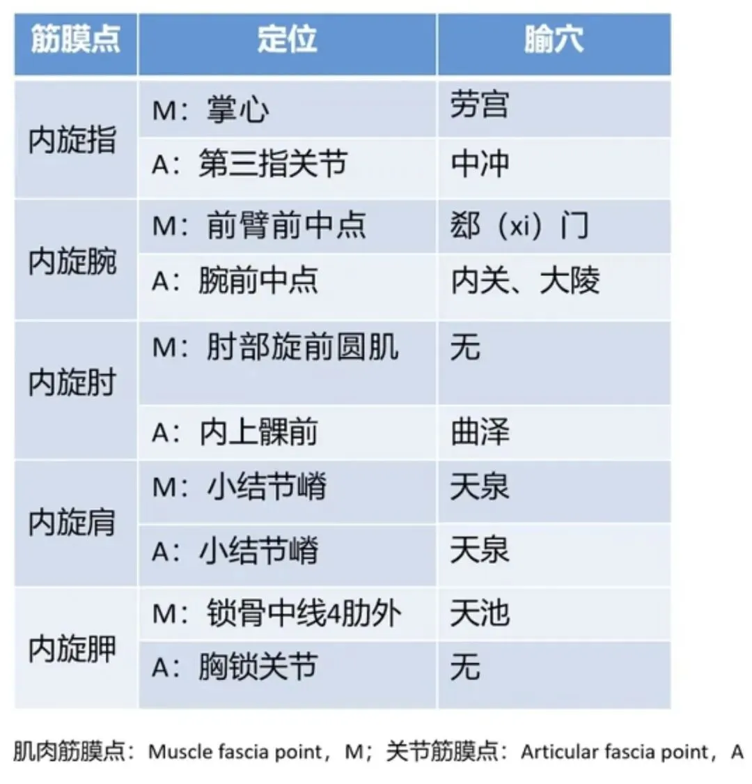 因此,这条内旋筋膜线上的关键筋膜点(交错点)包括:掌心(劳宫)、前臂中点(郄门)、内上髁旋前圆肌起点、小结节及小结节嵴、胸小肌附着处(云门、中府附近)。这些点既是力学枢纽,也是中医穴位所在。