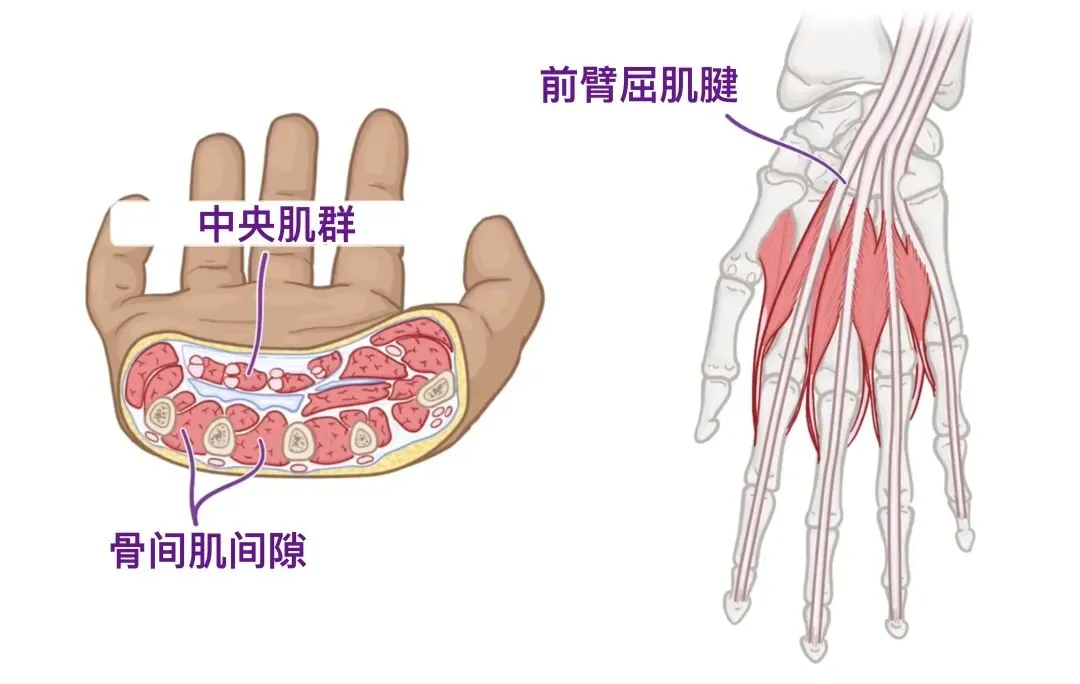 1. 手掌部(劳宫穴区域): 蚓状肌起于指深屈肌腱,止于指骨,收缩时可使掌指关节屈、指间关节伸。当蚓状肌收缩,尤其是远端固定时,可将屈肌腱及相连的筋膜向远端牵拉,协同前臂旋前。