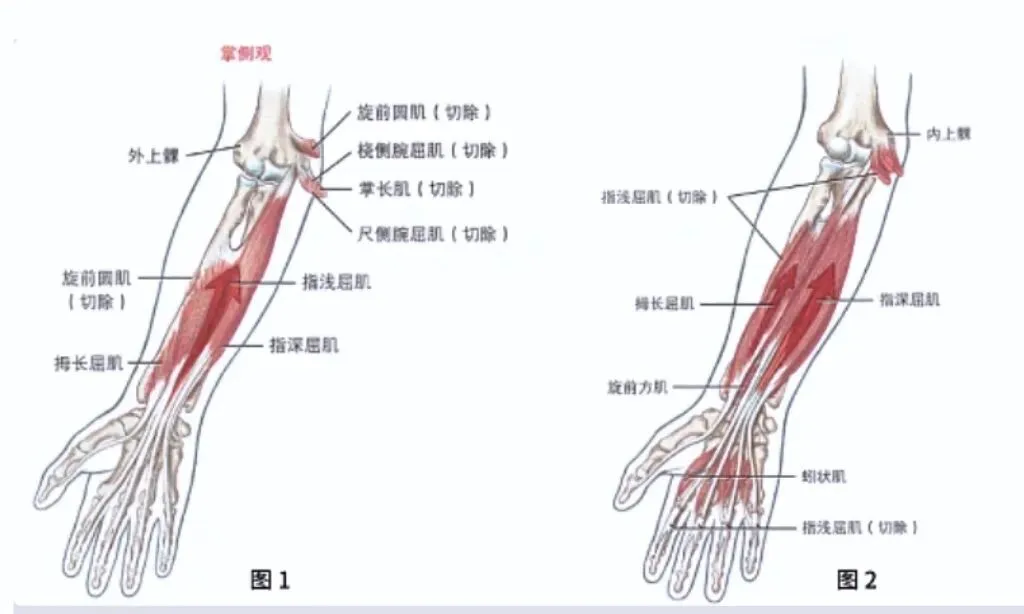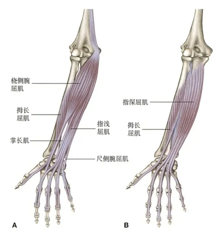 同时,掌长肌腱向下延续为掌腱膜,掌长肌收缩可紧张掌腱膜,辅助握拳与旋前。桡侧腕屈肌、尺侧腕屈肌、指浅深屈肌也参与此过程。