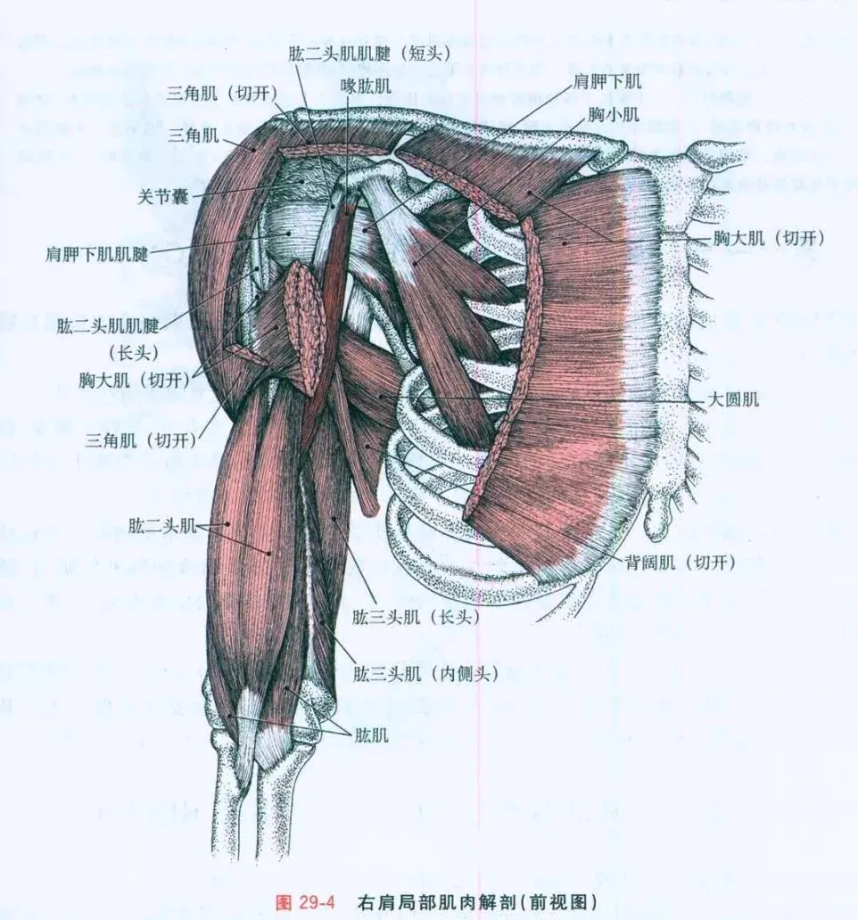 4. 肩关节部(肩胛下肌、小结节): 肩关节内旋的主要肌肉——肩胛下肌(肩胛下窝→肱骨小结节)、背阔肌(躯干后→小结节嵴)、大圆肌(肩胛下角→小结节嵴)——均止于小结节及小结节嵴。此处为多条内旋肌的肌腱交汇点,是应力集中区。此外,这些肌肉收缩时,通过筋膜连接可牵动深层的锁胸筋膜及胸小肌、胸大肌,进而影响肩胛骨的内旋(即肩胛骨前伸、下回旋)。