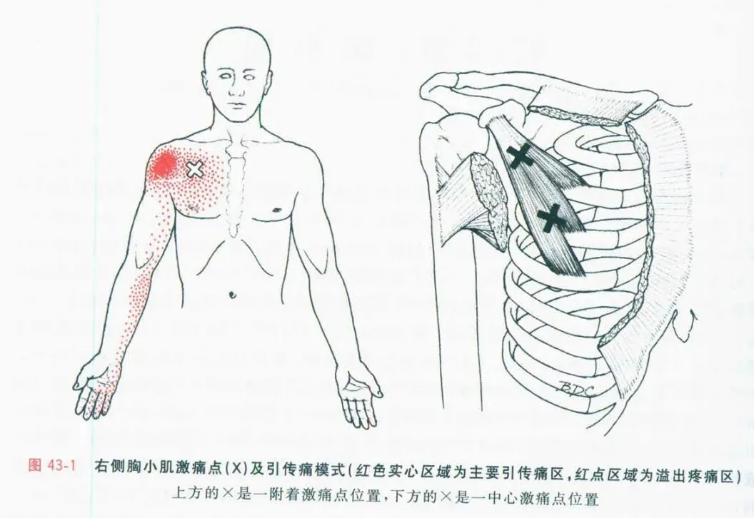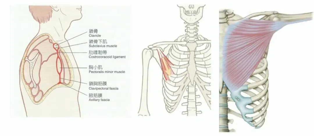 5. 胸前部(胸大肌、胸小肌区域): 胸小肌附着于喙突,其筋膜与锁胸筋膜、胸大肌筋膜相连。当肩胛下肌、背阔肌等内旋肌紧张或损伤时,可经筋膜链传导至胸小肌,导致含胸圆肩姿态。
