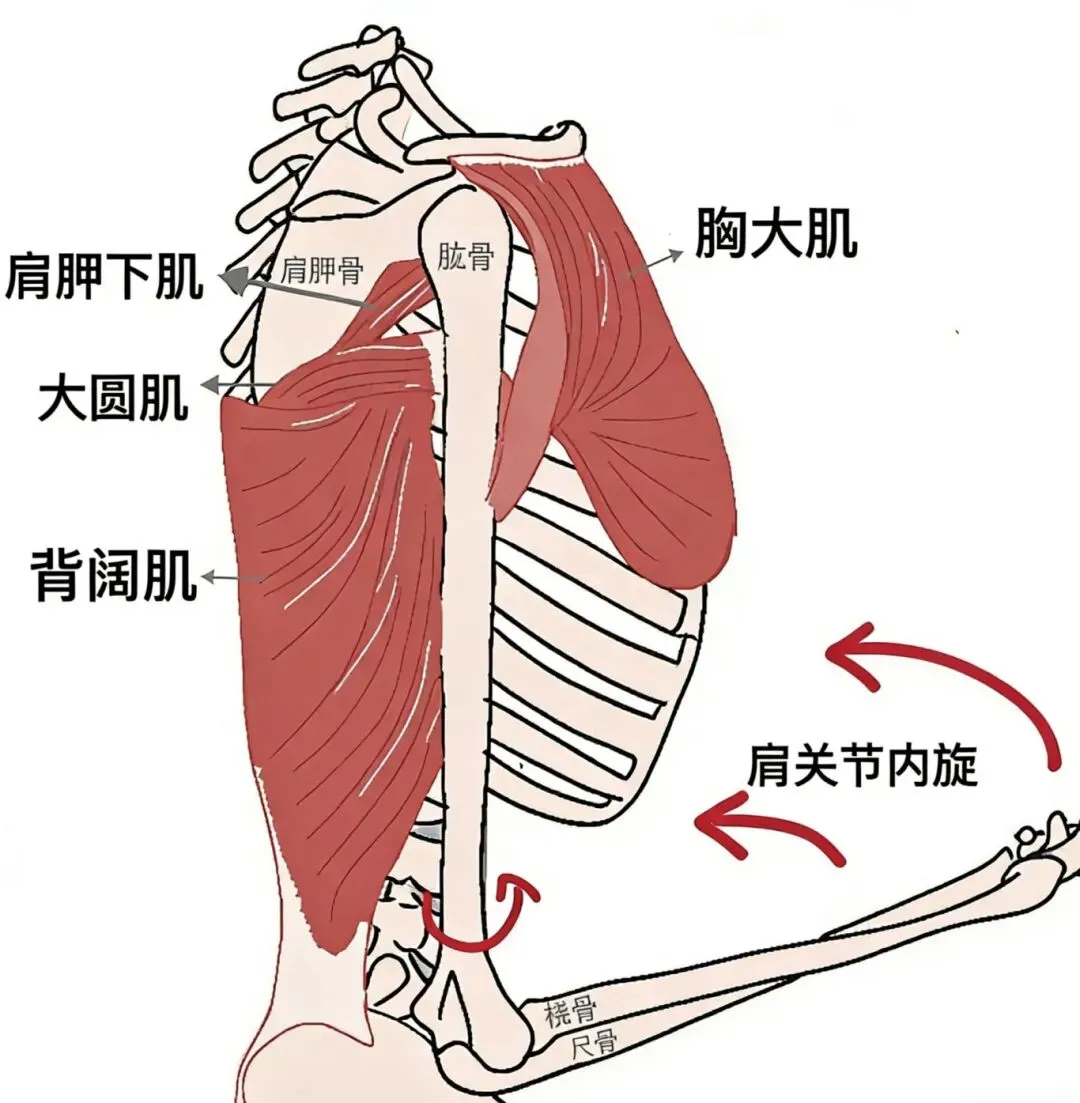 上肢内旋是一个复合动作,并非单一关节的运动。肩关节的内旋主要由肩胛下肌、背阔肌、大圆肌等完成,同时需要胸大肌、胸小肌配合以稳定肩胛骨的位置,保证肩胛胸壁关节的协调。