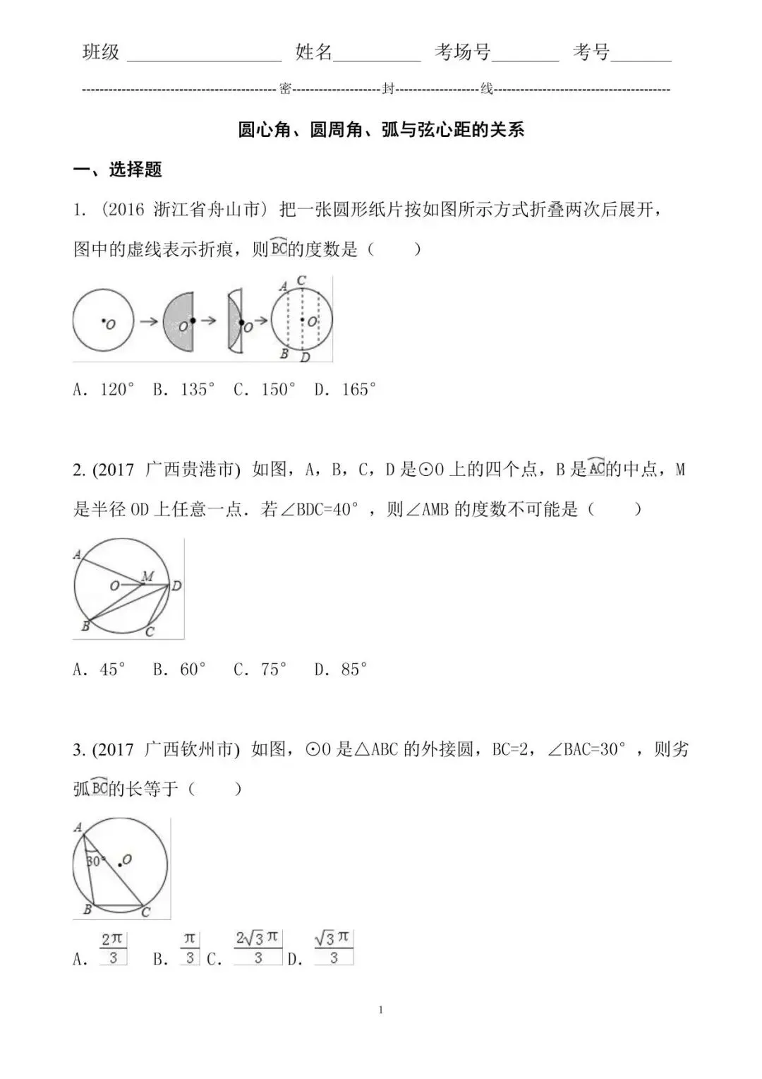 1. 考点圆心角、弧、弦的关系;翻折变换(折叠问题).