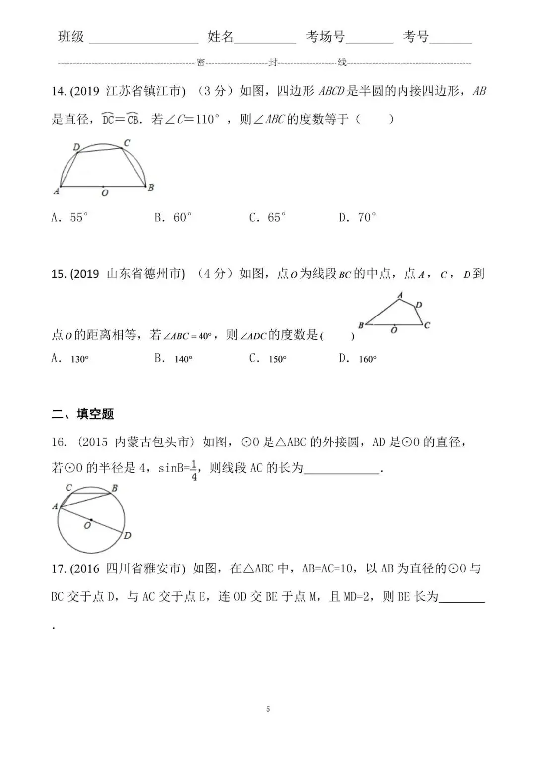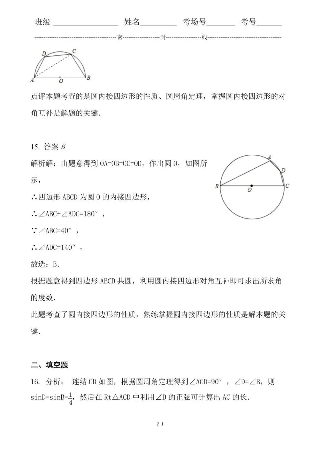 15. 答案B.根据题意得到四边形ABCD共圆,利用圆内接四边形对角互补即可求出所求角的度数.