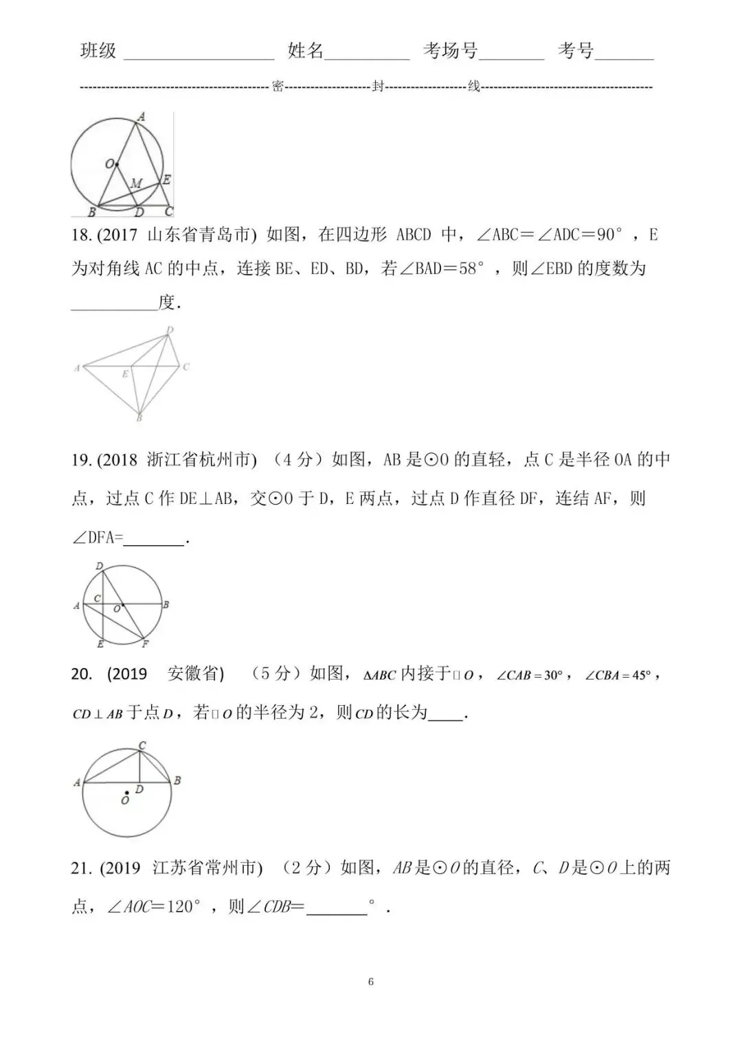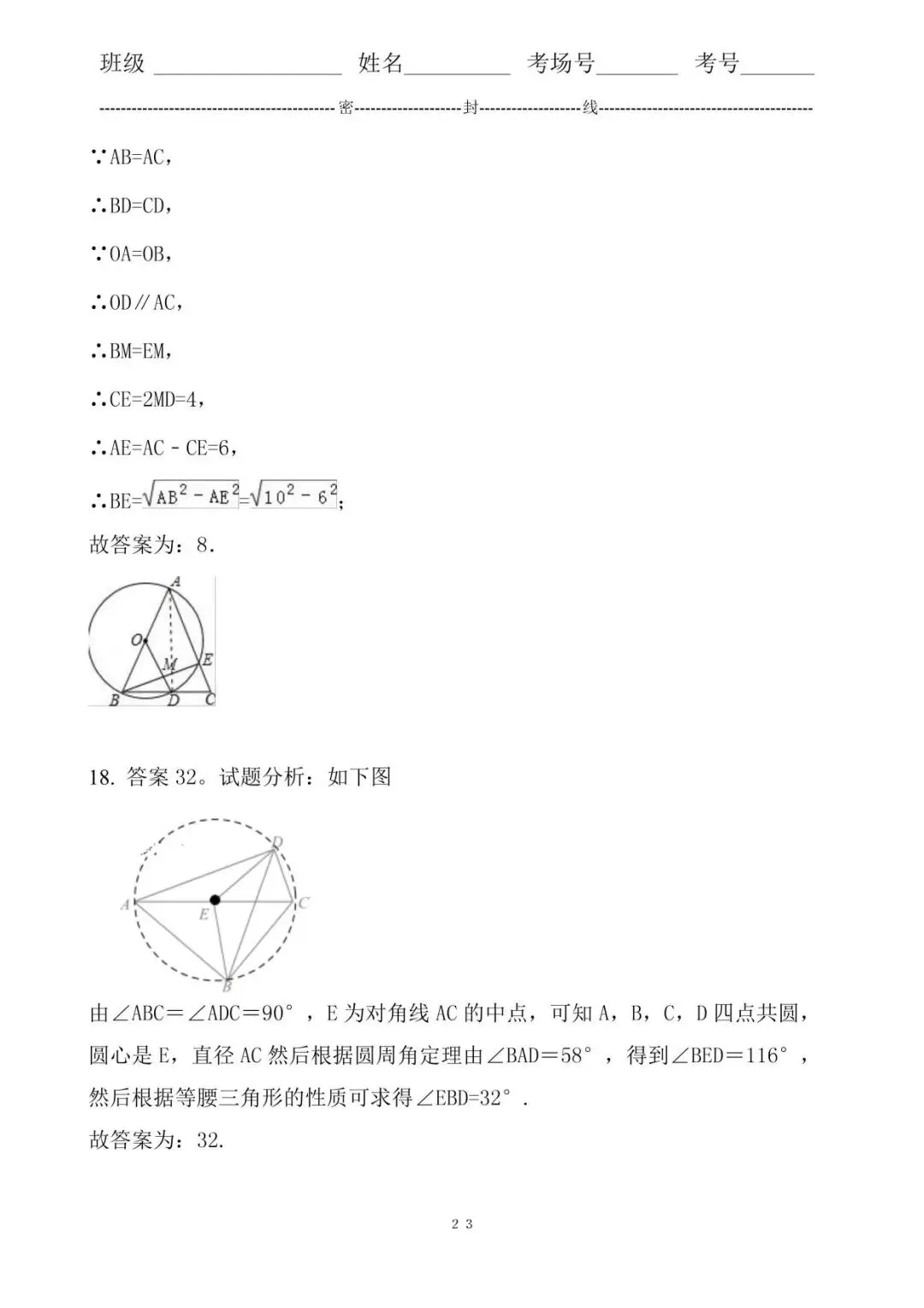 18.答案32。试题分析:由∠ABC=∠ADC=90°,E为对角线AC的中点,可知A,B,C,D四点共圆,圆心是E,直径AC然后根据圆周角定理由∠BAD=58°,得到∠BED=116°,然后根据等腰三角形的性质可求得∠EBD=32°.