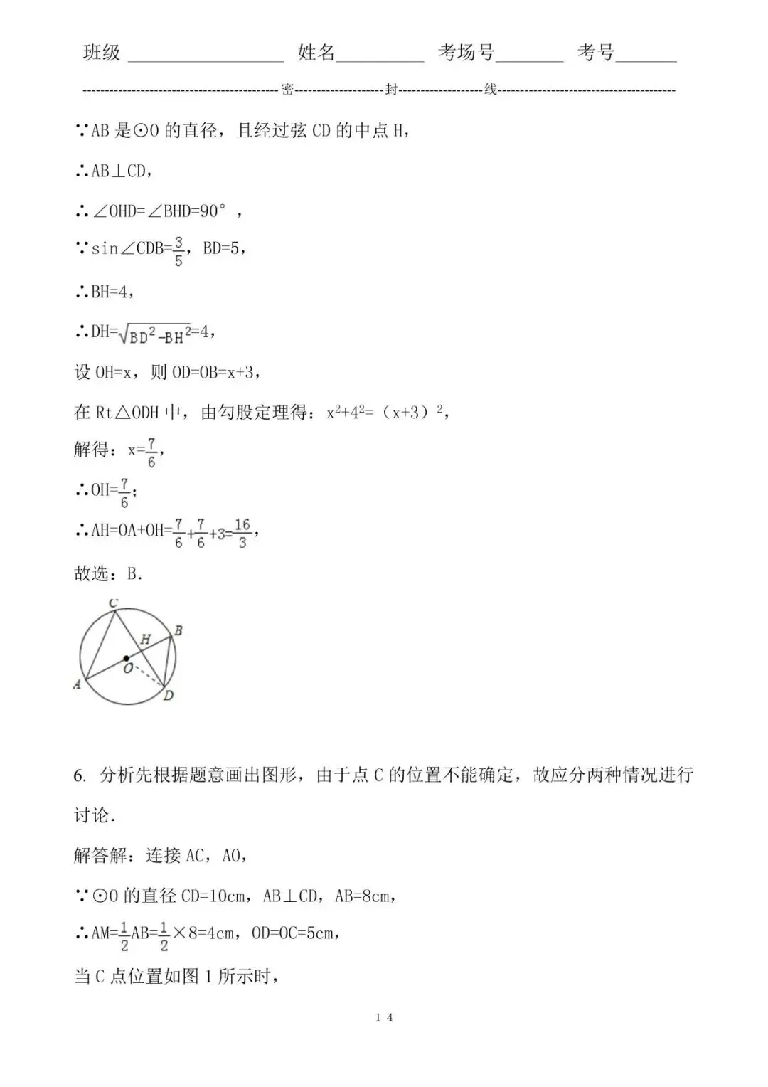 5. 分析连接OD,由垂径定理得出AB⊥CD,由三角函数求出BH=3,由勾股定理得出DH= =4,设OH=x,则OD=OB=x+3,在Rt△ODH中,由勾股定理得出方程,解方程即可.