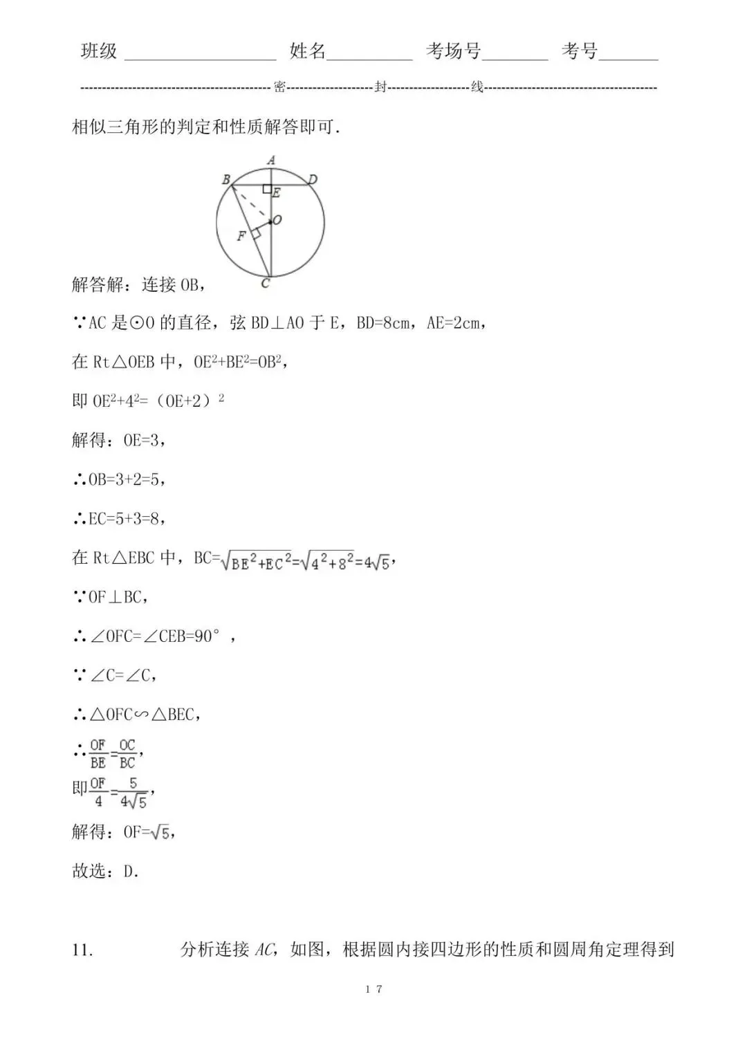 10. 分析根据垂径定理得出OE的长,进而利用勾股定理得出BC的长,再利用相似三角形的判定和性质解答即可.