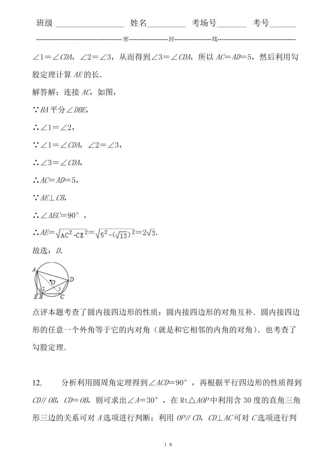 点评本题考查了圆内接四边形的性质:圆内接四边形的对角互补.圆内接四边形的任意一个外角等于它的内对角(就是和它相邻的内角的对角).也考查了勾股定理.