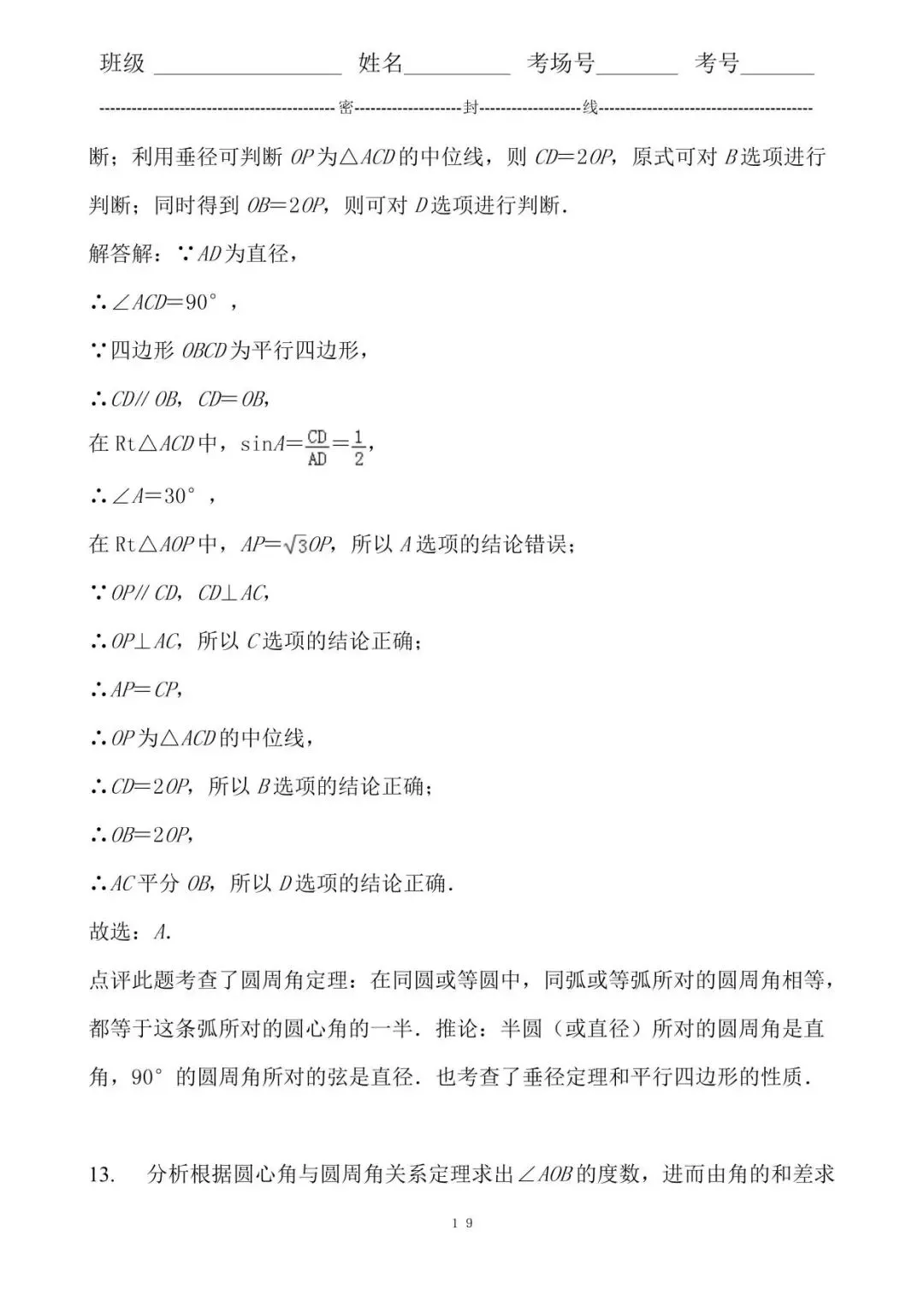 12. 分析利用圆周角定理得到∠ACD=90°,再根据平行四边形的性质得到CD∥OB,CD=OB,则可求出∠A=30°,在Rt△AOP中利用含30度的直角三角形三边的关系可对A选项进行判断;利用OP∥CD,CD⊥AC可对C选项进行判断;利用垂径可判断OP为△ACD的中位线,则CD=2OP,原式可对B选项进行判断;同时得到OB=2OP,则可对D选项进行判断.