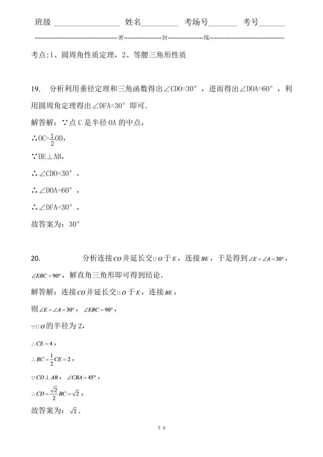 19.分析利用垂径定理和三角函数得出∠CDO=30°,进而得出∠DOA=60°,利用圆周角定理得出∠DFA=30°即可.
