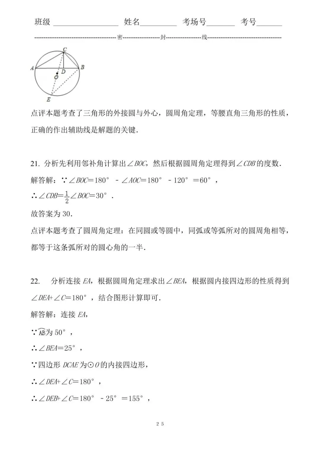 21. 分析先利用邻补角计算出∠BOC,然后根据圆周角定理得到∠CDB的度数.