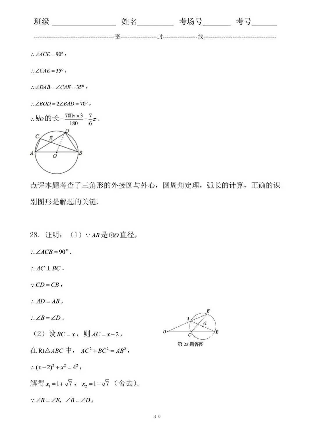 22. 分析连接EA,根据圆周角定理求出∠BEA,根据圆内接四边形的性质得到∠DEA+∠C=180°,结合图形计算即可.