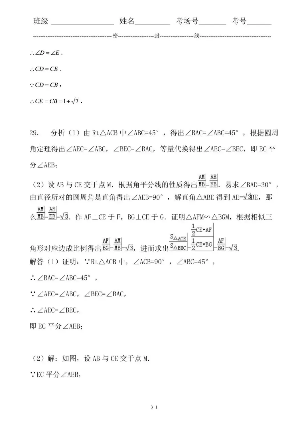29. 分析(1)由Rt△ACB中∠ABC=45°,得出∠BAC=∠ABC=45°,根据圆周角定理得出∠AEC=∠ABC,∠BEC=∠BAC,等量代换得出∠AEC=∠BEC,即EC平分∠AEB;