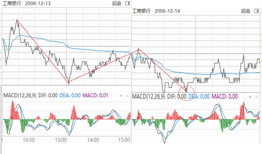注:三十分钟的回抽,就说明这在30分钟上仅仅是一段,是一个完成的五分钟上的走势类型,在五分钟上,就寻找这个背驰点即可。我用缠师的经典案例工商银行,看看这个五分钟的第一类买点。没有当时的五分钟图,我用分时图拼的,需要注意的是12月11日、12日在小级别上是趋势走势类型,而从13日到14日两个是一个盘整走势类型,这就是缠师说的趋势+盘整是最大的力度。